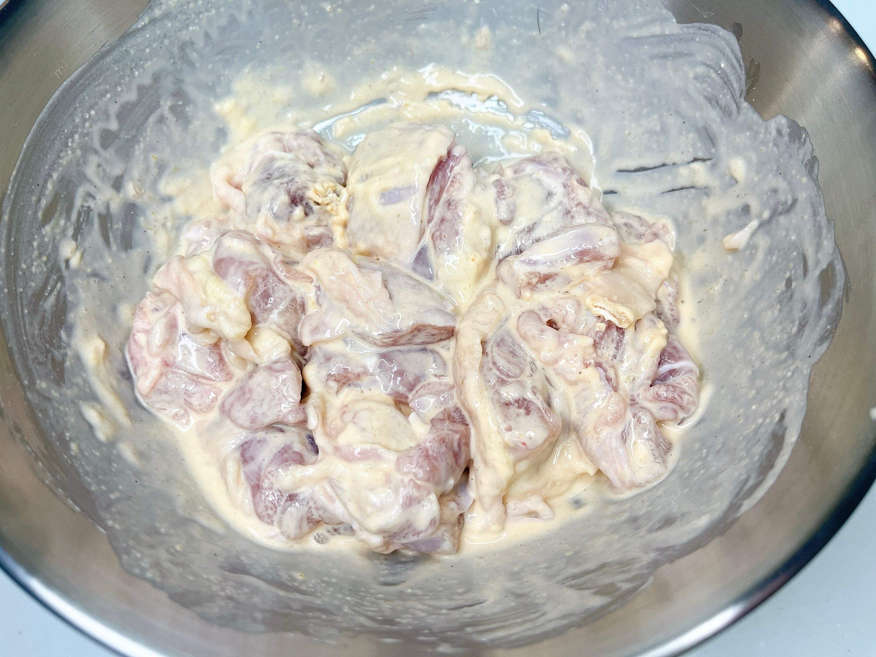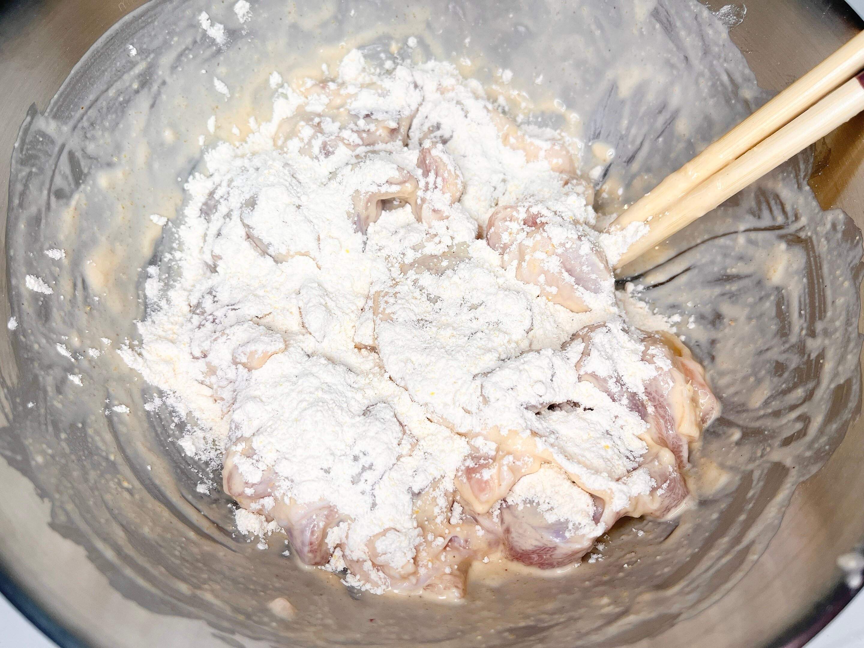 1.本品(約40g)と塩少々を水で溶き、一口サイズに切った鶏肉(約300g)とよく絡めます。