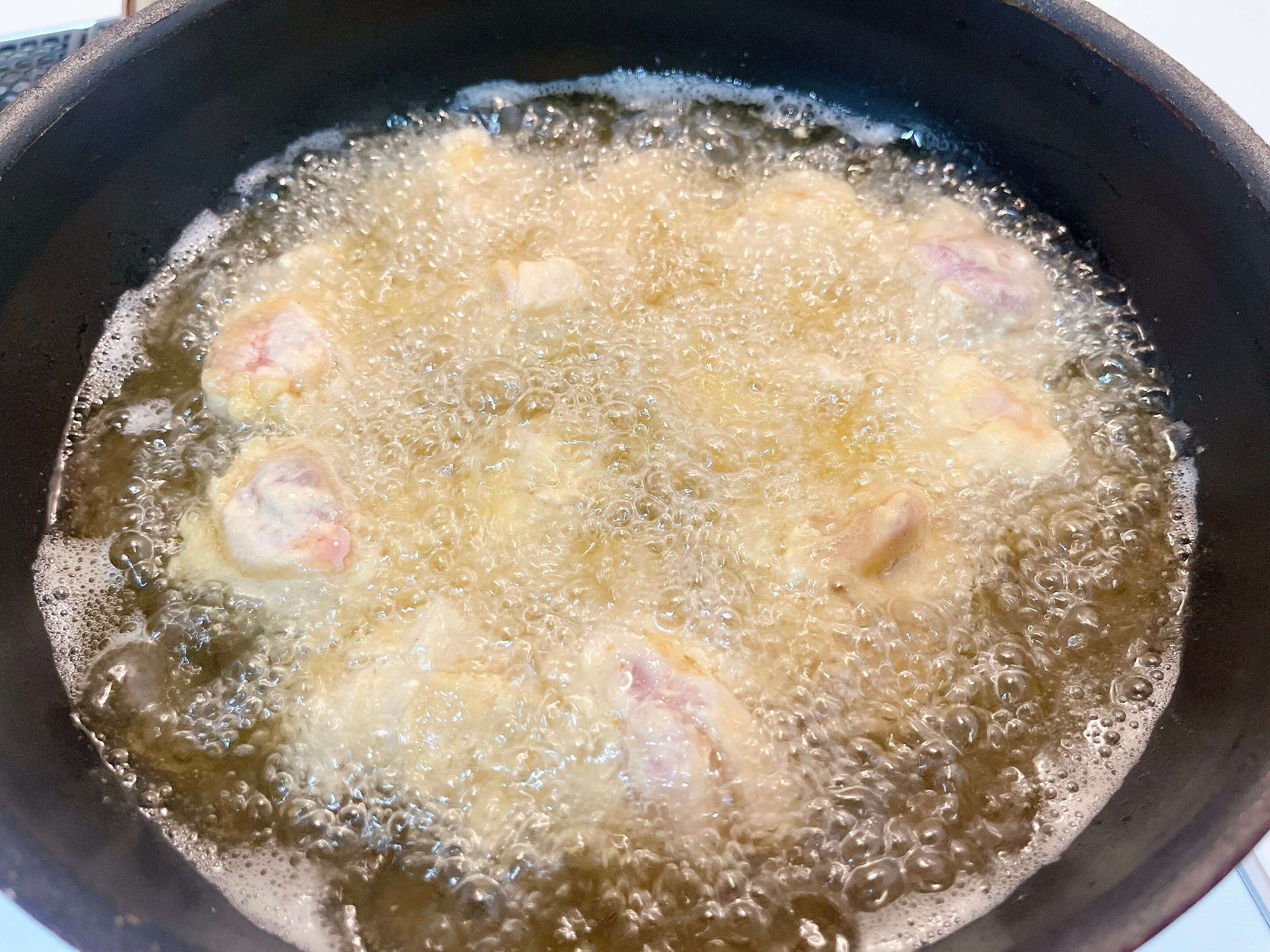 3.170~180℃の油で4~5分揚げます。そして油を切り、約5分冷まします。