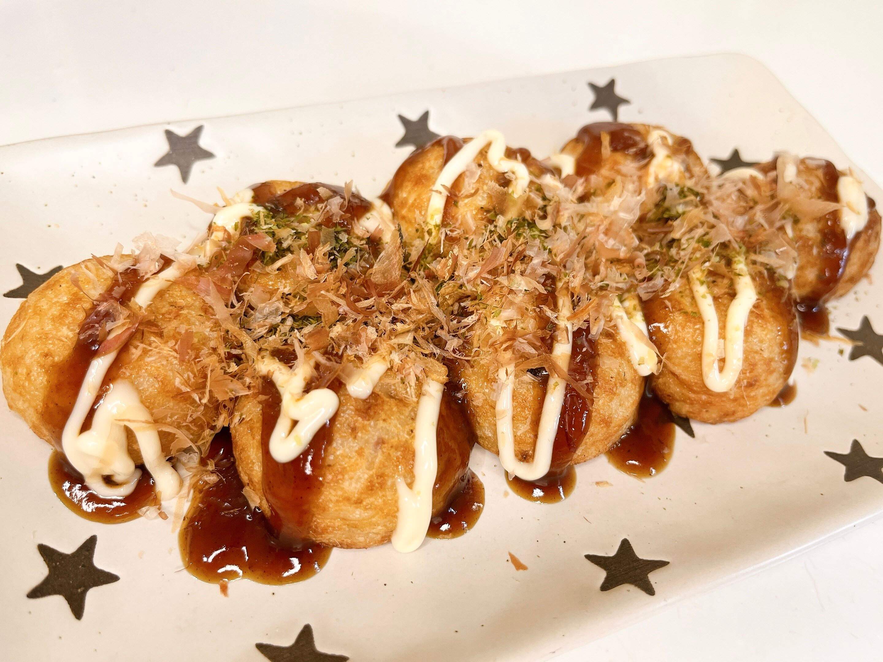 ソース、マヨネーズ、鰹節、青のりをたっぷりかけて頂きました。