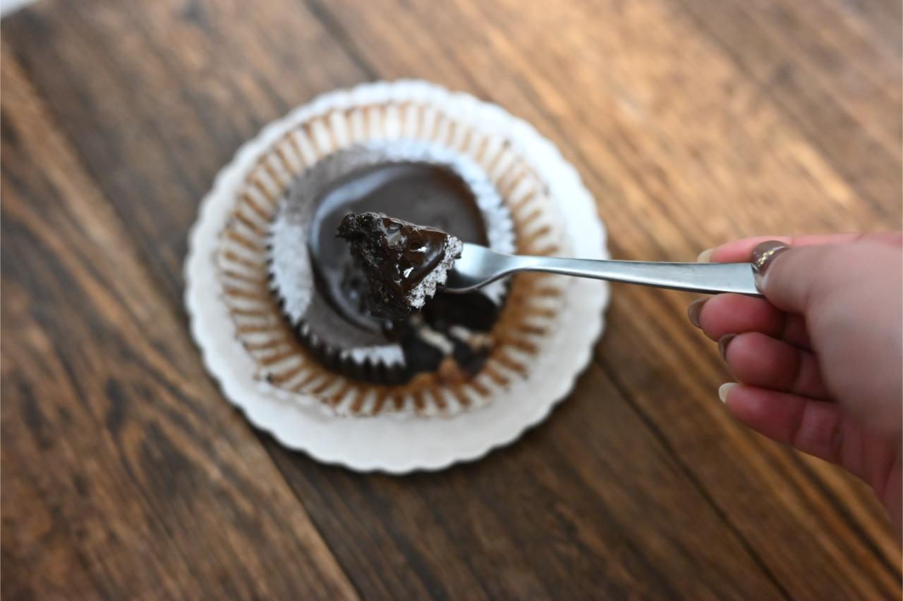 中央のチョコレートスプレッドがとろりと溶け出し、フォークを入れた瞬間に中から溢れ出すチョコソース。