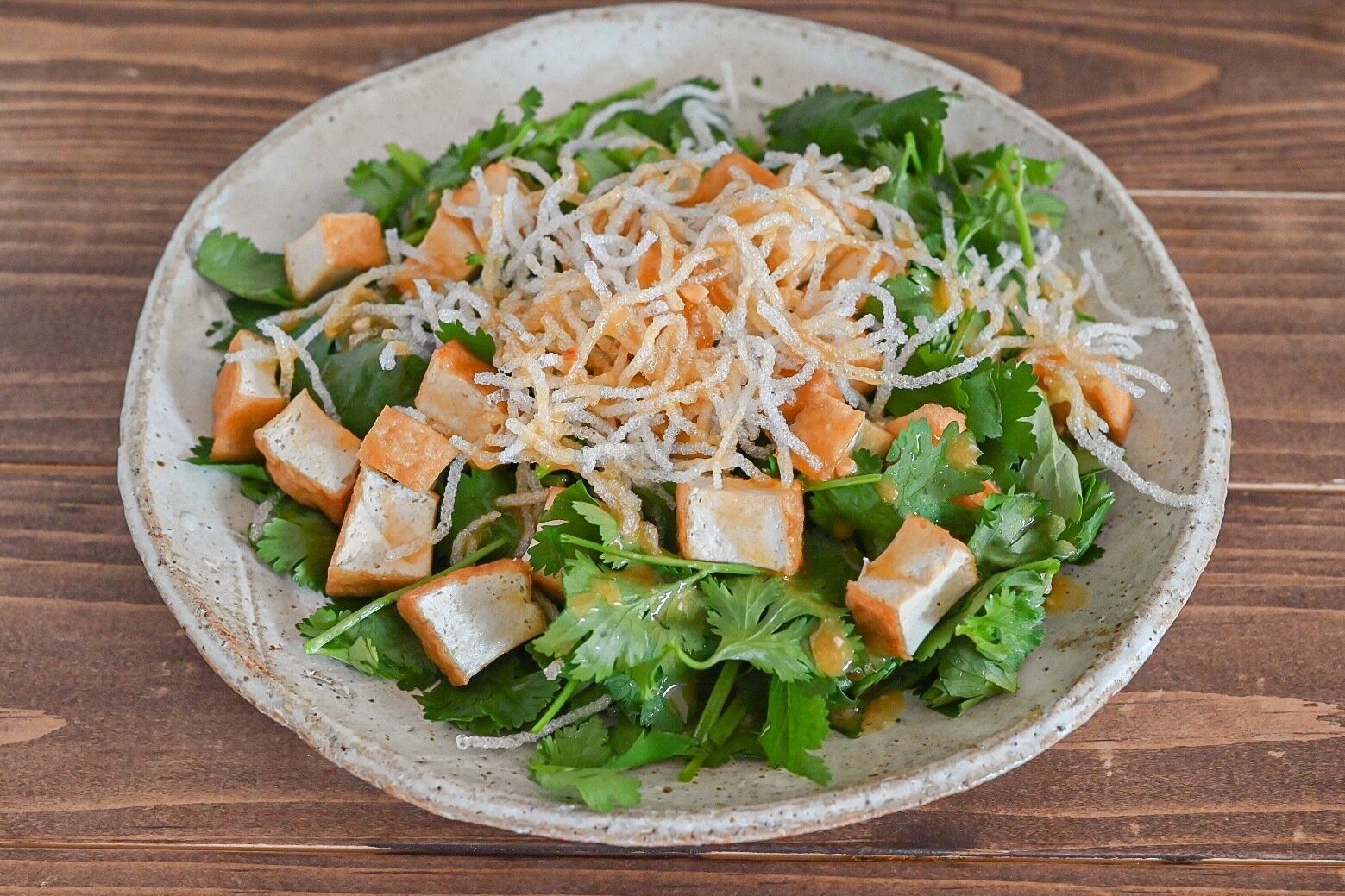 (5)パクチー、厚揚げ、はるさめを皿に盛り、ドレッシングをかけて完成。