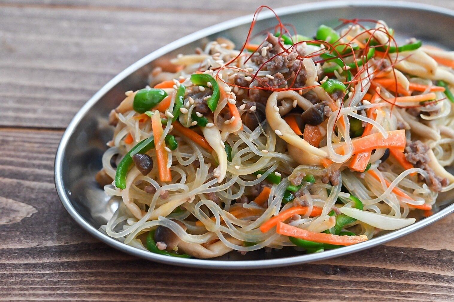 ひき肉で作れる、チャプチェ風の炒め物レシピです。