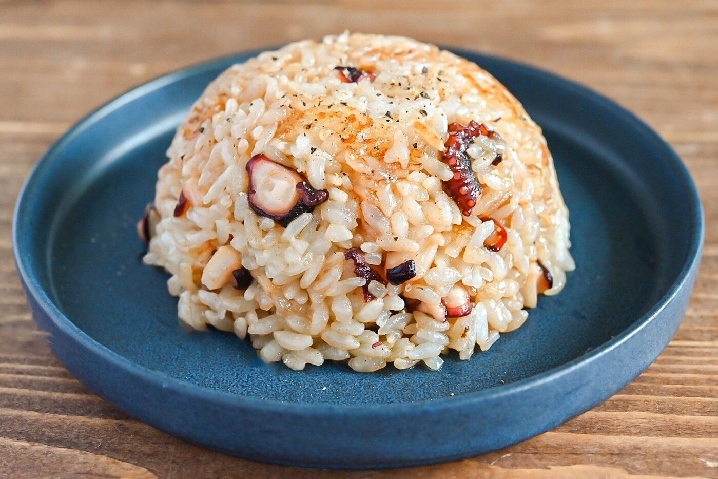 (4)しょうゆ、酒を加えて中火にし、たこ、炊いたごはんを加えて全体を混ぜ合わせる。
