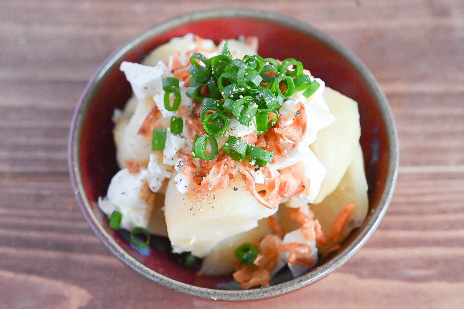 (5)フライドオニオンを入れて混ぜたら器に盛り、粗びき黒こしょうと小口切りした小ねぎをのせて完成。