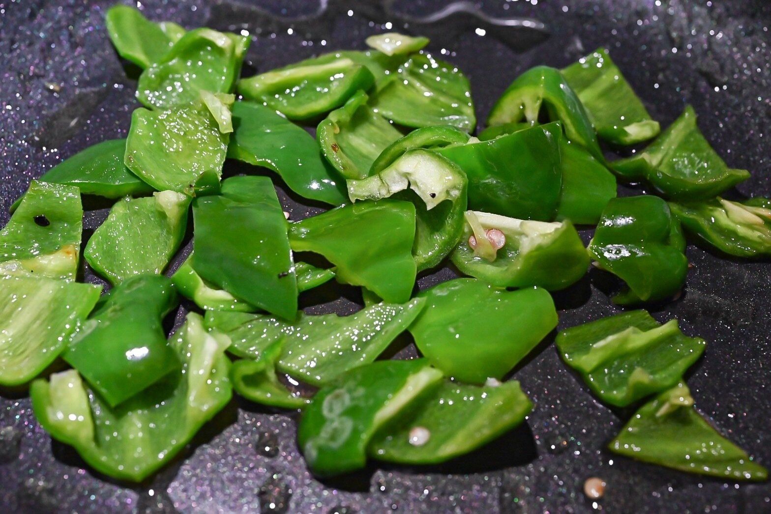 (2)なすを取り出し、ピーマンを炒める。