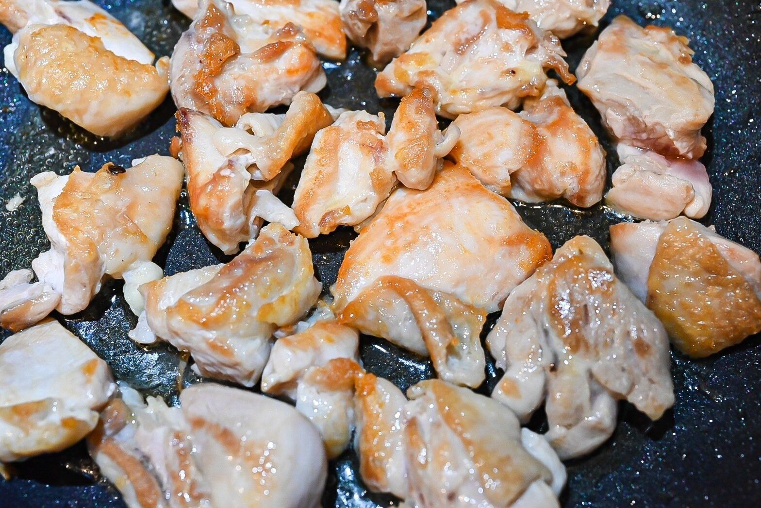 (4)鶏もも肉の皮目を下にして焼き色がつくまで加熱して裏返す。