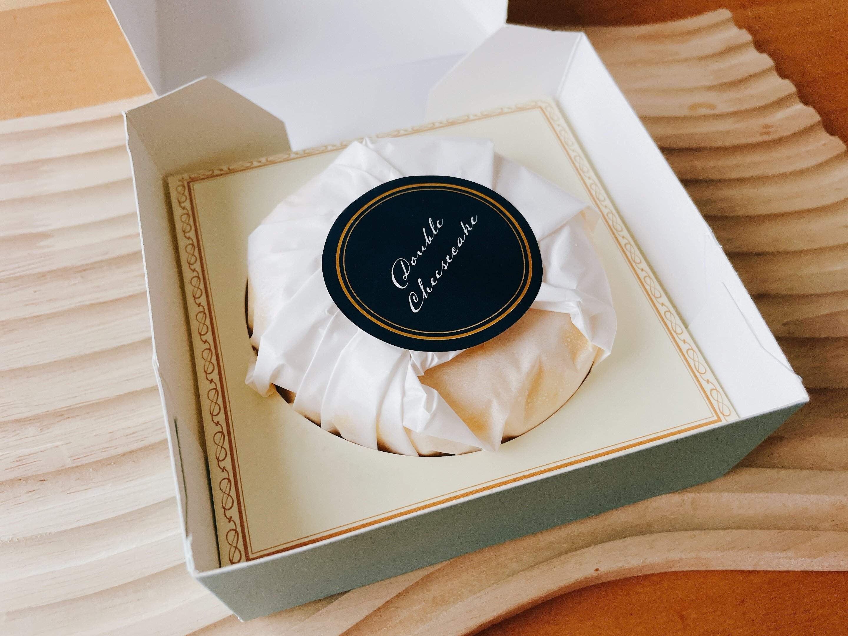 箱はクリーム色、水色、金色でまとまったおしゃれなデザインで箱を開けてみると紙に包まれ、高級感のあるシールで止められたダブルチーズケーキの登場です。