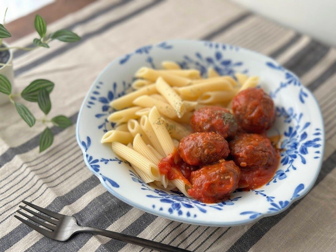 大振りなミートボールは、牛豚合い挽きで、つなぎにパン粉そして、玉ねぎもまぜ込まれていてハンバーグに近い食感です。