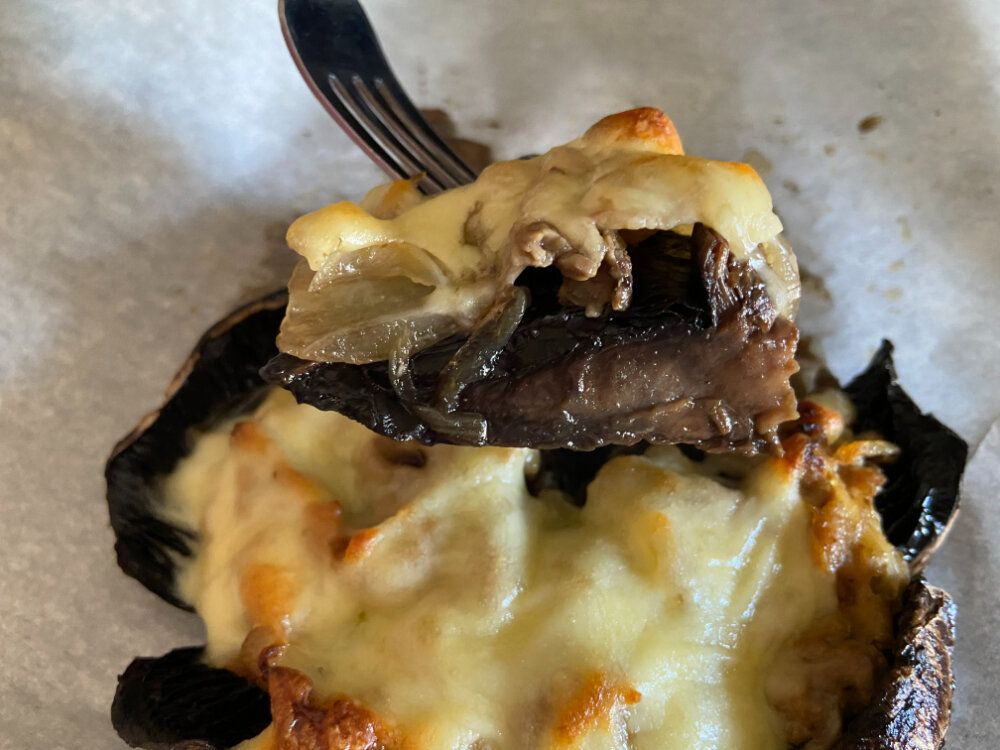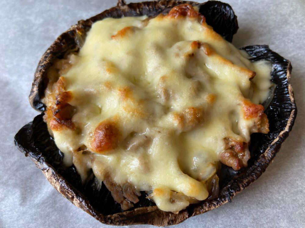 マッシュルームの内側にソテーした豚肉と玉ねぎをのせて、チーズをたっぷりのせて、オーブンで200℃20分で焼きました。大きな大きなマッシュルームのオーブン焼きの完成です。
