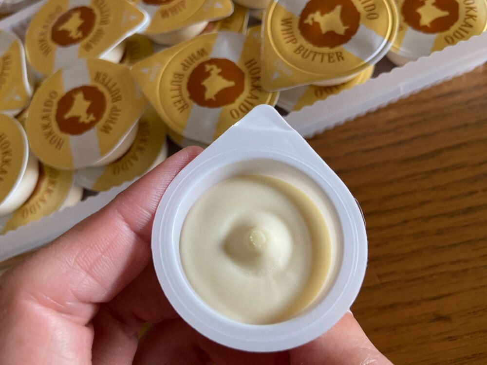 北海道産の生乳を100%使用。普通のバターに比べて生クリームを加えて混ぜ合わせているので、空気を含んでホイップのように軽い口当たりになっているのが特徴です。