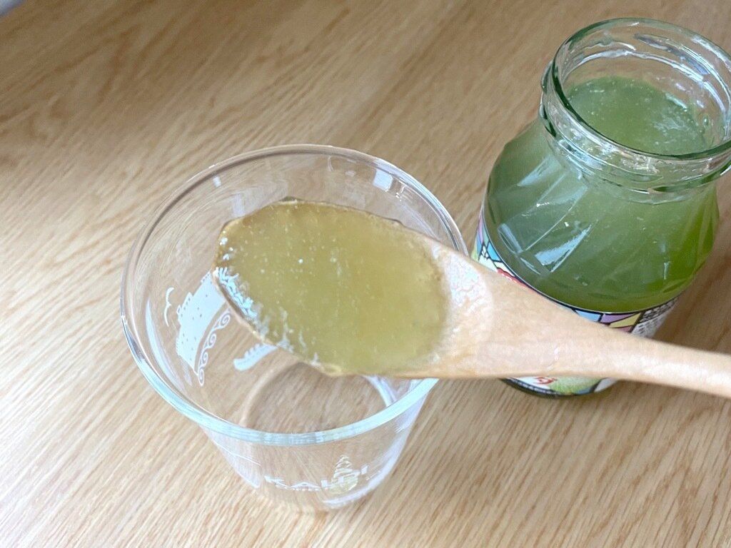 シロップのようなサラッとしたテクスチャーを想像していましたが、トロっとしたジュレに近いようなテクスチャーです。香りはほとんど感じませんが、鼻を近づけると熟れる前の若いメロンのような香りをほんのり感じます。