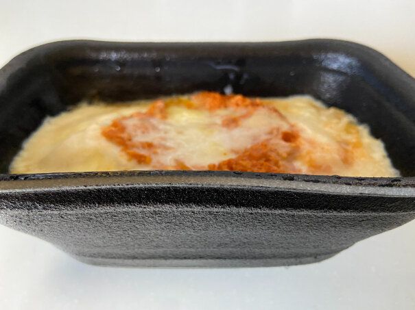 温め直後は容器がとても熱くなっているので、要注意!チーズとホワイトソースがたっぷりかかっています。