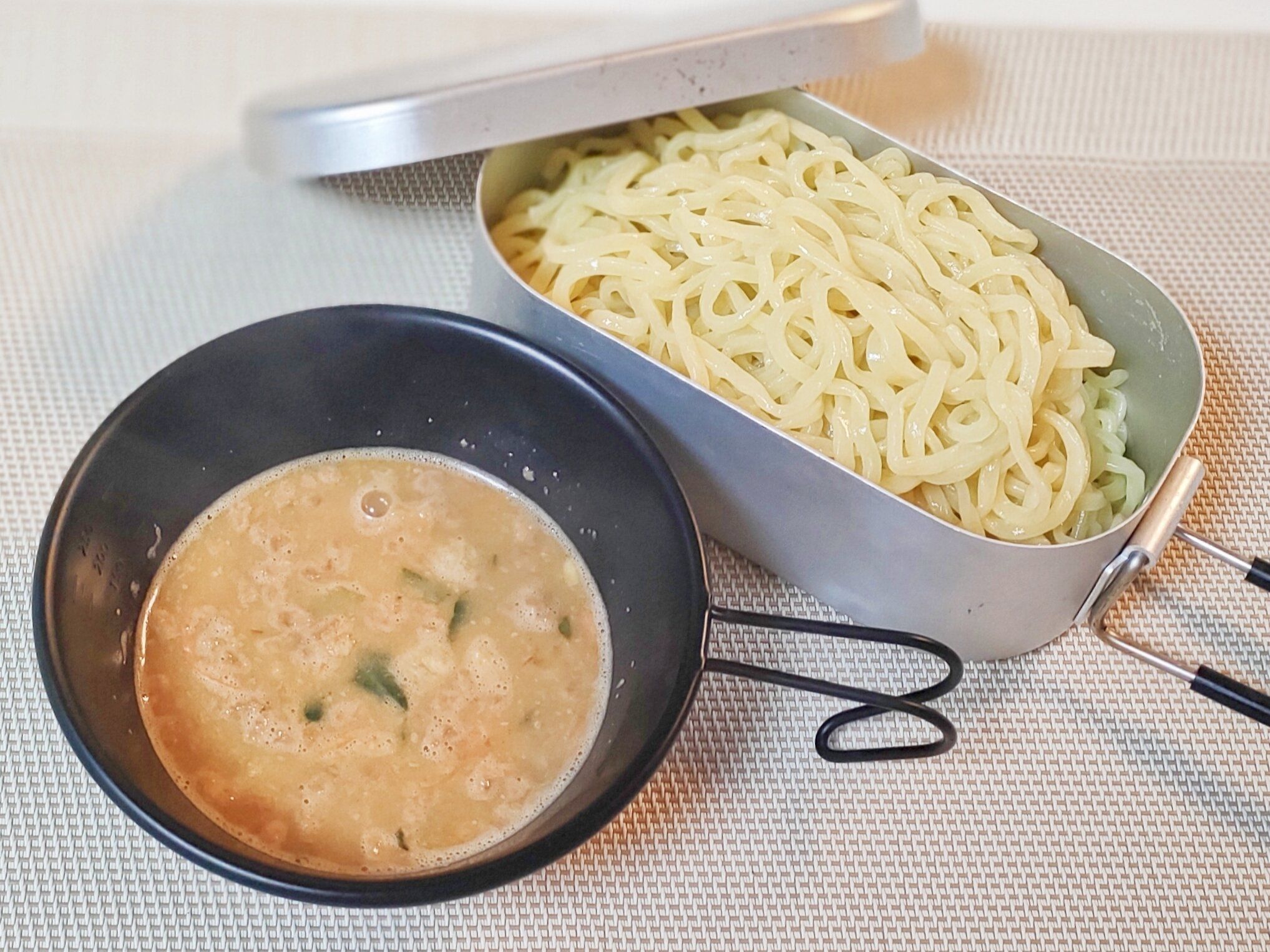 お湯を入れたらさっと一瞬で溶けました!しっかりと具も感じられて、おいしいつけ麺のスープになりました。