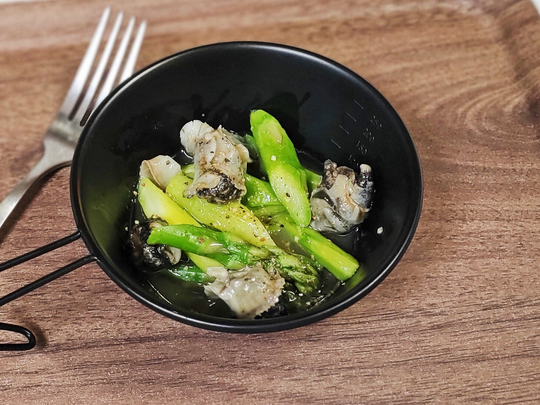 アヒージョオイルはしっかりと味がついているので、追い野菜をするのがオススメ!今回はアスパラガスを加えてみました。
