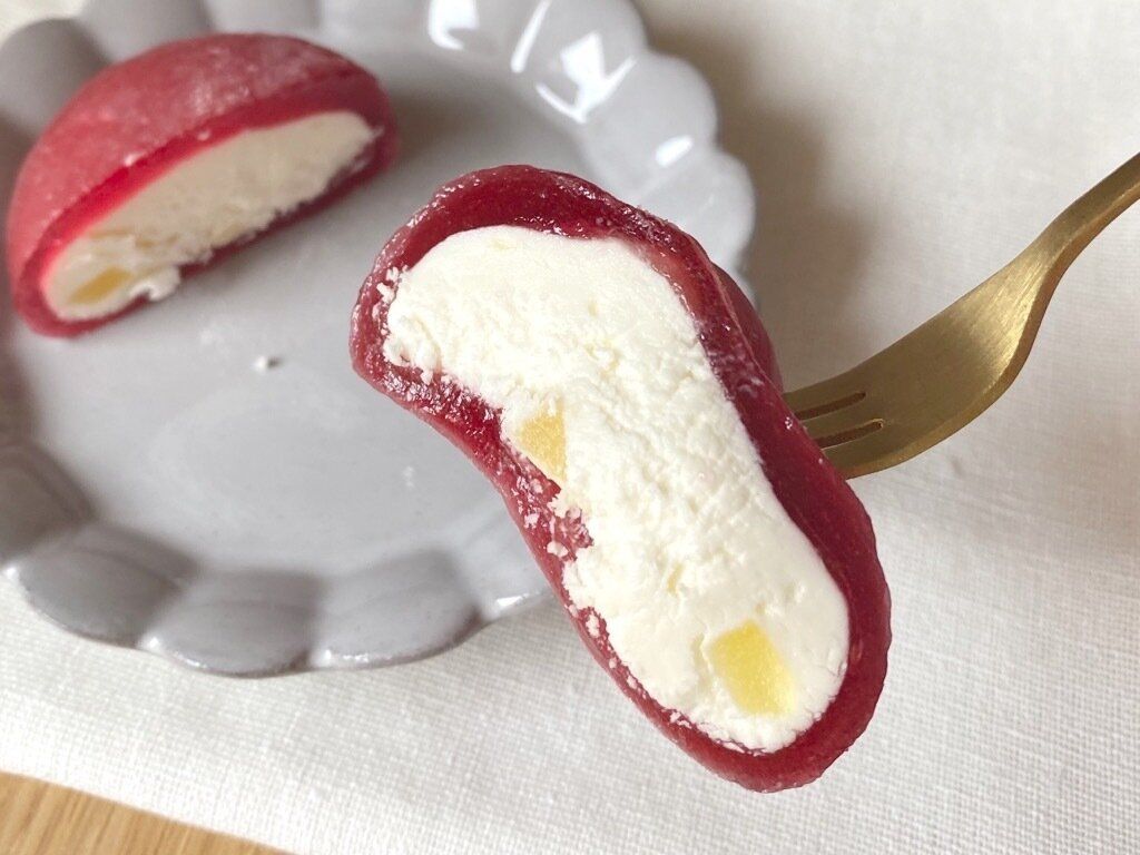 クリームは甘さ控えめでミルキーさの中にいちごの甘酸っぱさと香りが際立ちます。柔らかいわらび餅とふわふわのクリームは口の中でとろけていき、至福の食感を楽しめますよ。