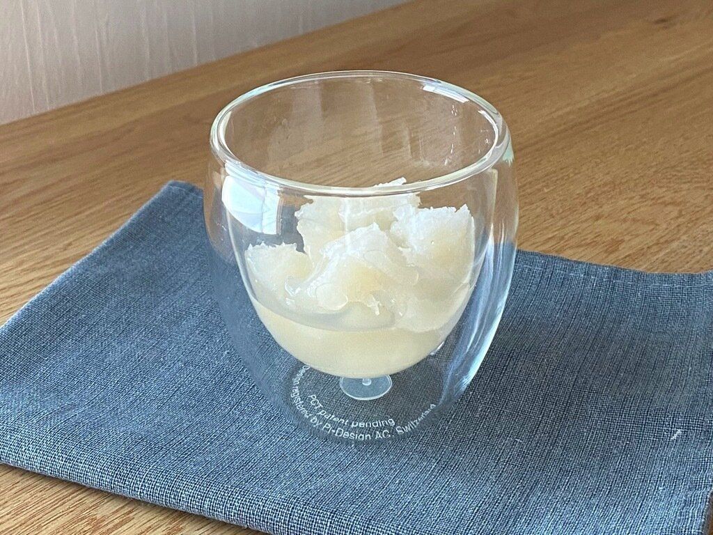 かき氷のようなガリガリと硬めの食感を想像していましたが、シャリっとシャーベットのような食感で、口どけなめらかに溶けていきます。