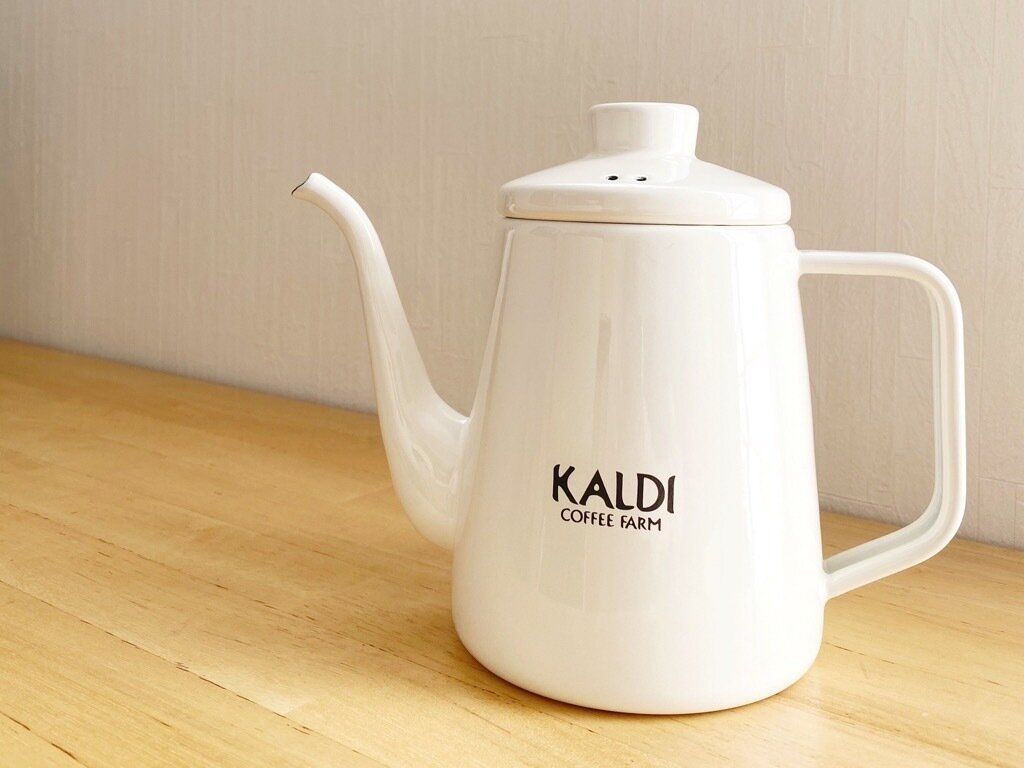 注ぎ口が細くドリップがしやすい構造になったカルディオリジナルのドリップケトル。臭いや汚れがつきにくいホーロー素材でつくられています。