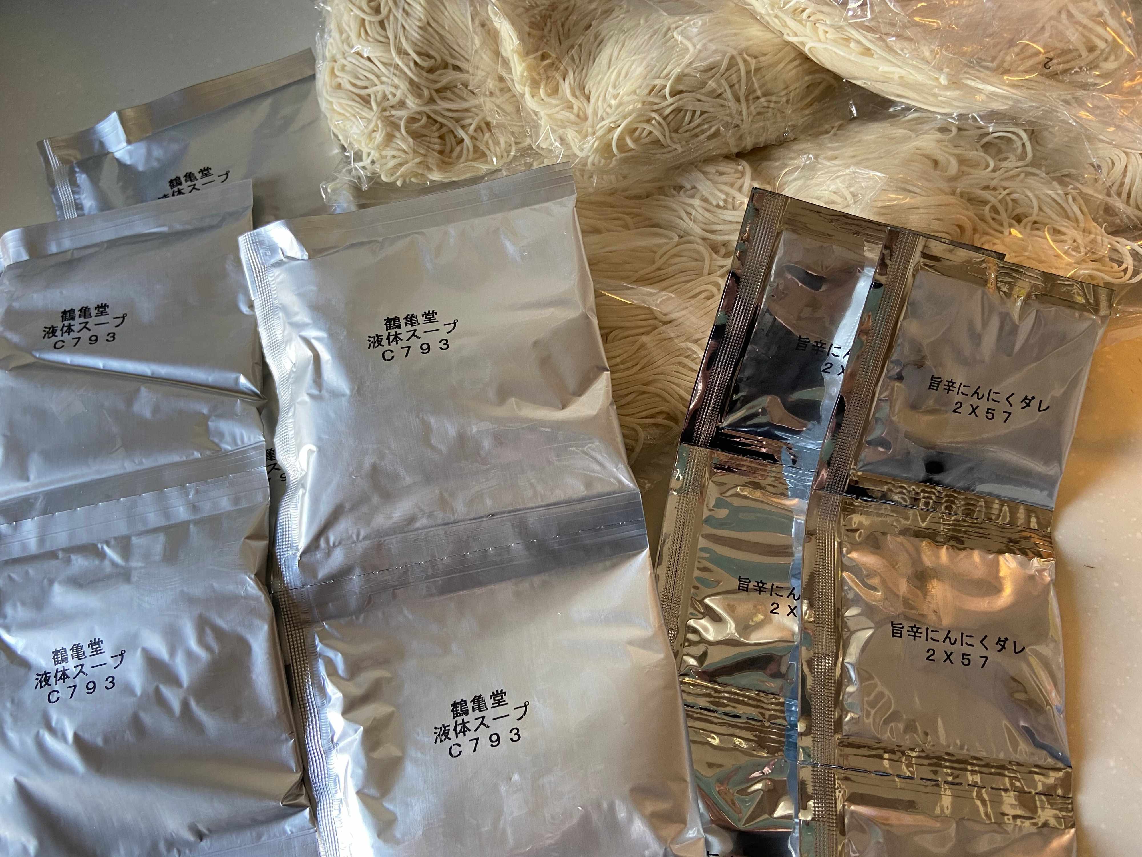 箱を開けると中には、麺、液体スープ、旨辛にんにくダレがそれぞれ6袋ずつ入っていました。