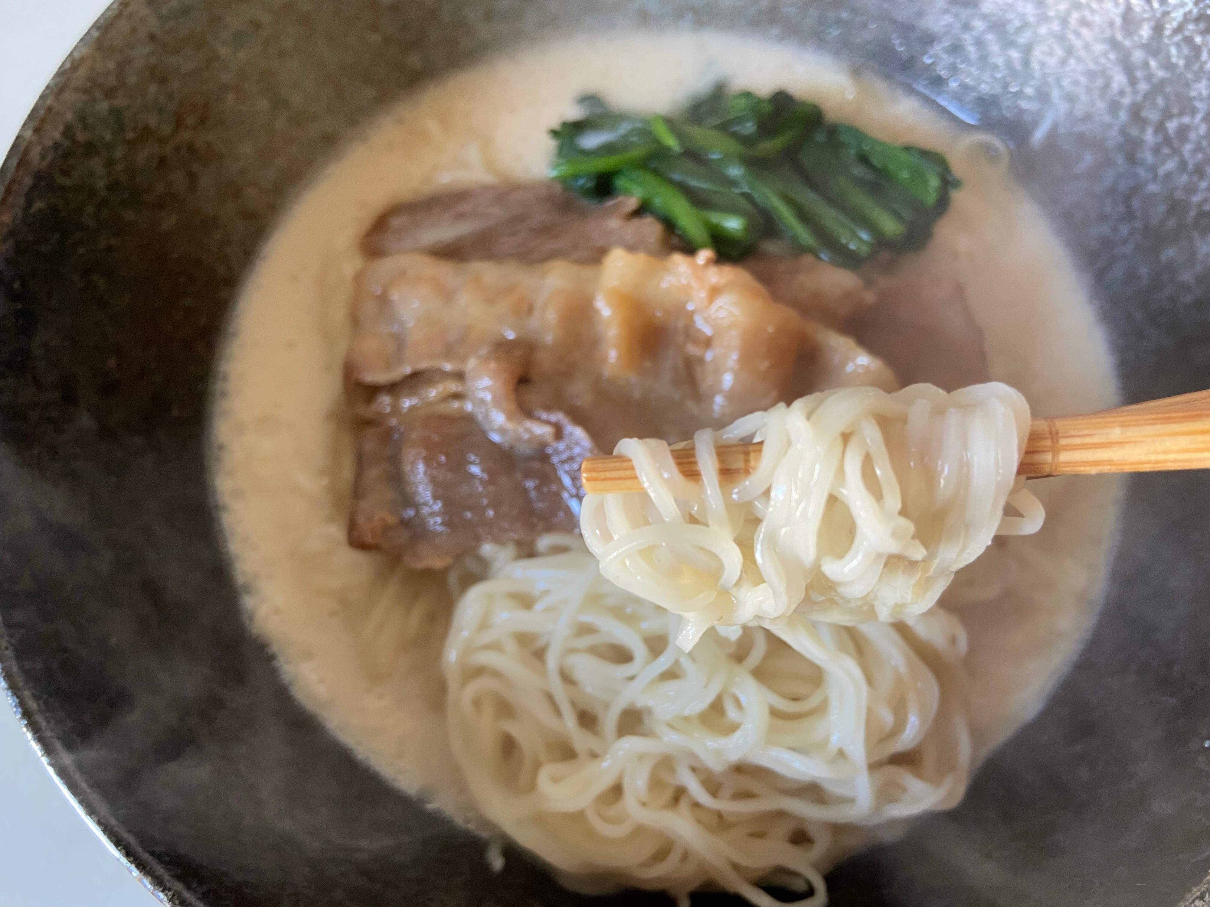 スープはとっても濃厚!商品名の通りクリーミーでコクがあります。とんこつのくさみはなく、旨みたっぷりでやみつきになりそう!