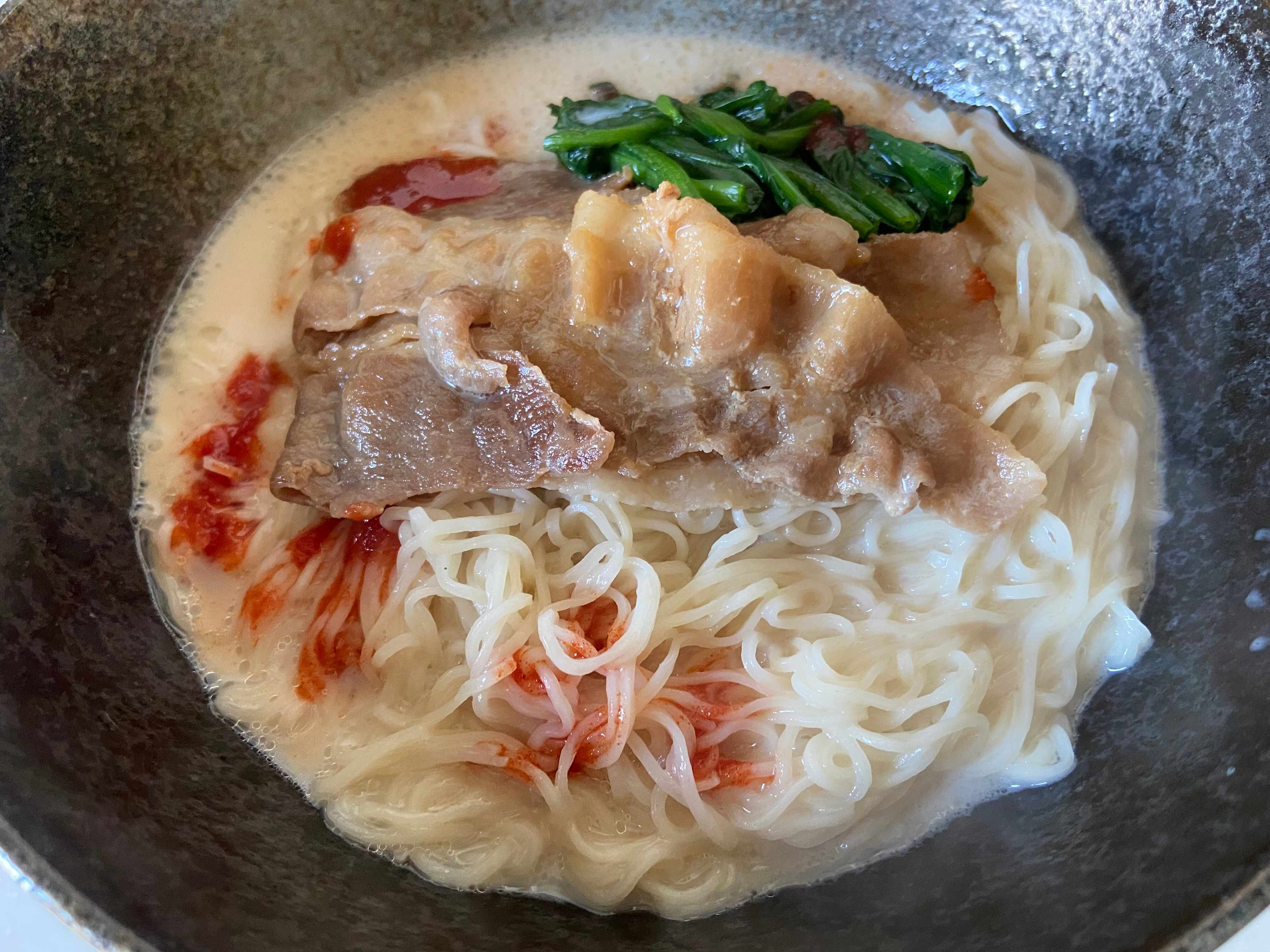 最初、麺を40秒ほど茹でたらかなり柔らかめになってしまったので、次は20秒で茹でてみました。汁を吸収しやすいタイプの麺なので、ちょっと早いかな…くらいが、ちょうどいい固さになります。