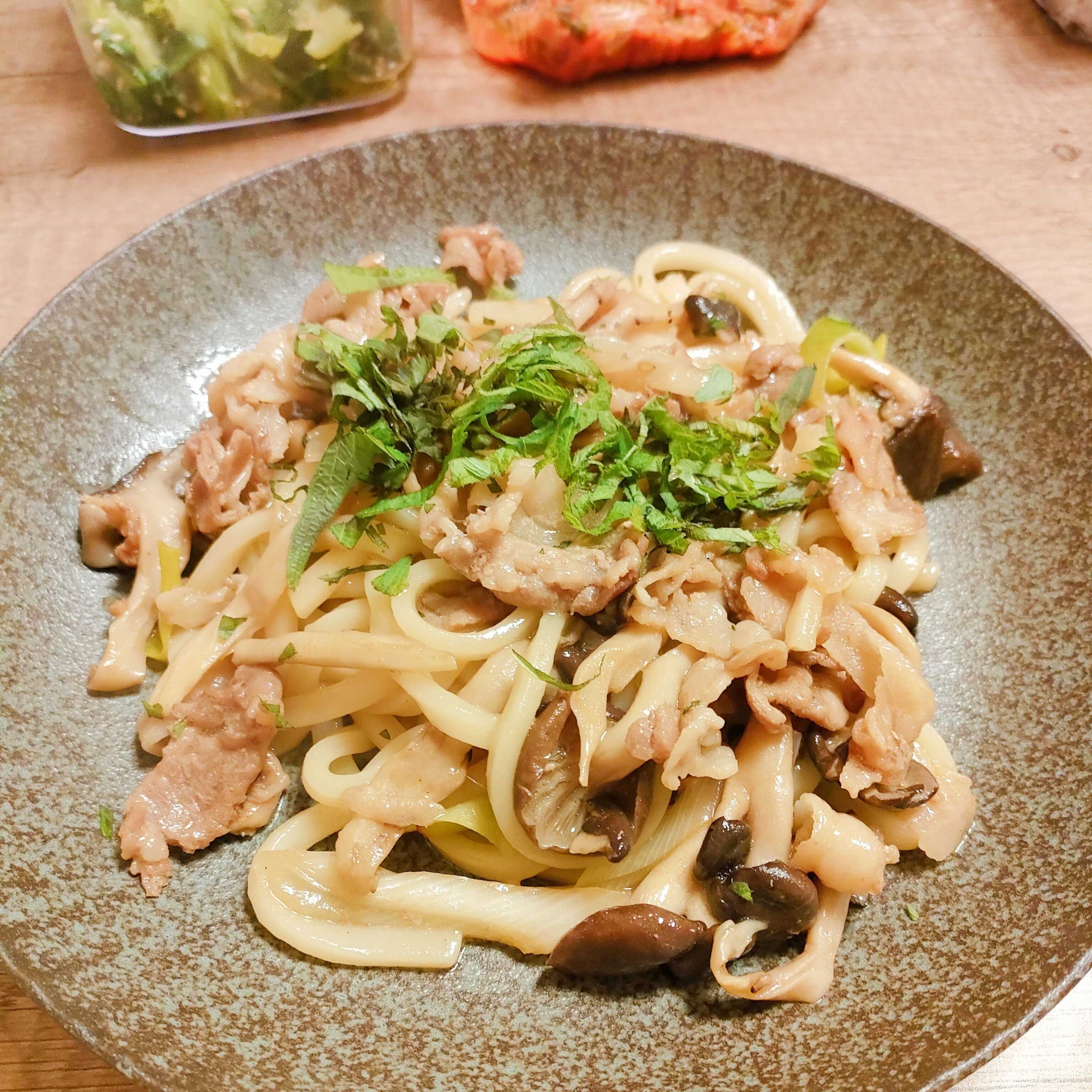 豚バラ肉を使い、お肉の脂をひらたけが吸い上げて、旨味をぐんぐん増していく感じがします。それをうどんにからめることでメイン食材ともうまくマッチしました。
