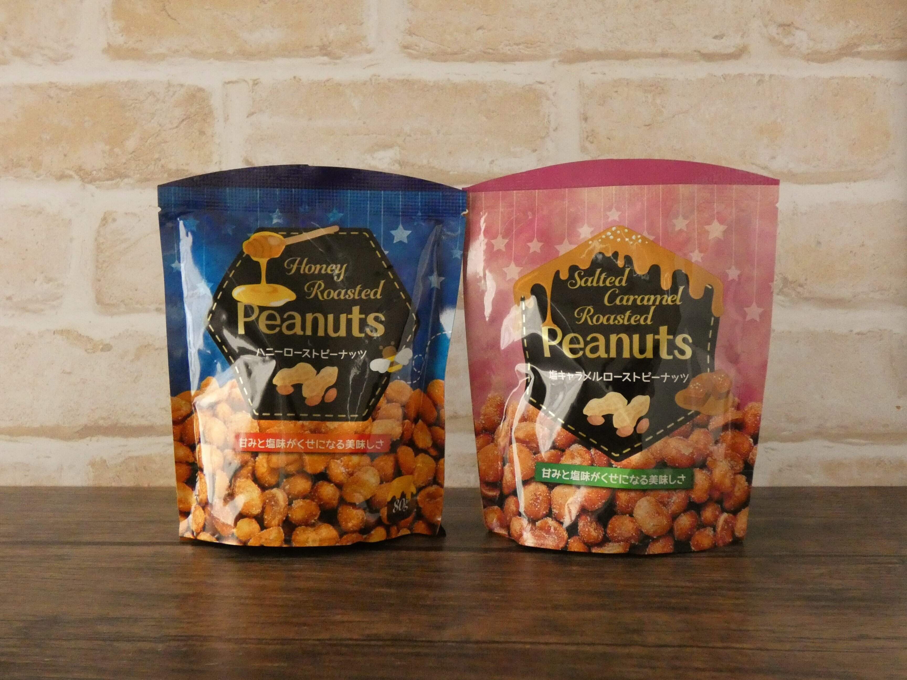 ハニーローストピーナッツはやさしいはちみつの甘さと、ほどよい塩加減がちょうどいいです。塩キャラメルローストピーナッツは袋を開けたら、甘塩っぱさがクセになり、おやつやおつまみにピッタリです。