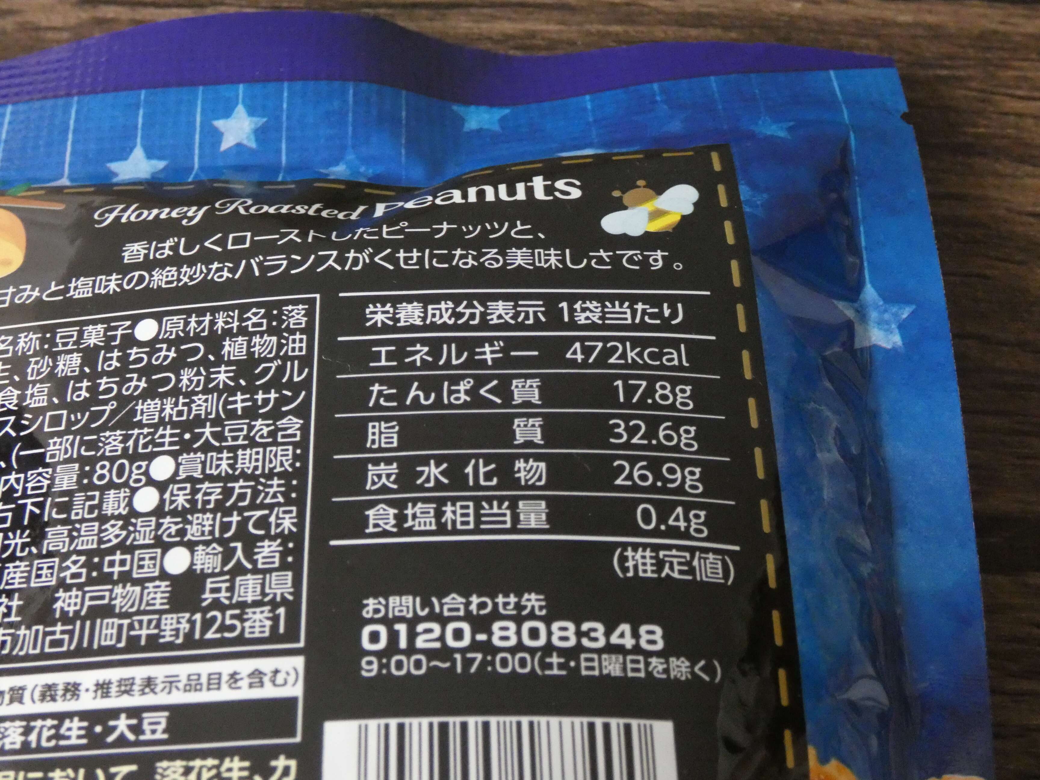 栄養成分表示を見ると、ハニーローストピーナッツ1袋あたりのエネルギーは472kcal。