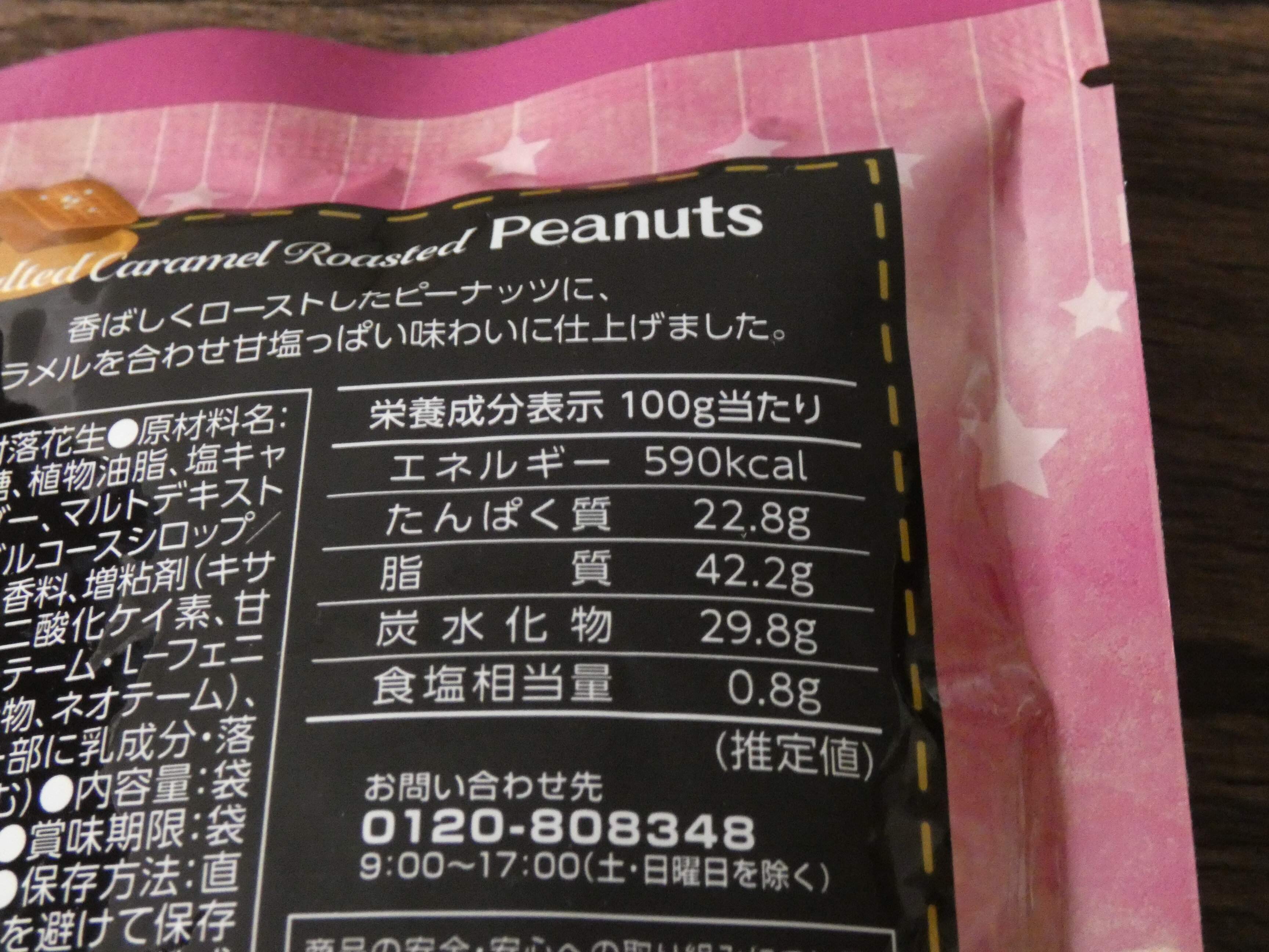 塩キャラメルローストピーナッツ100gあたりのエネルギーは590kcal。(1袋あたりのエネルギーは472kcal)