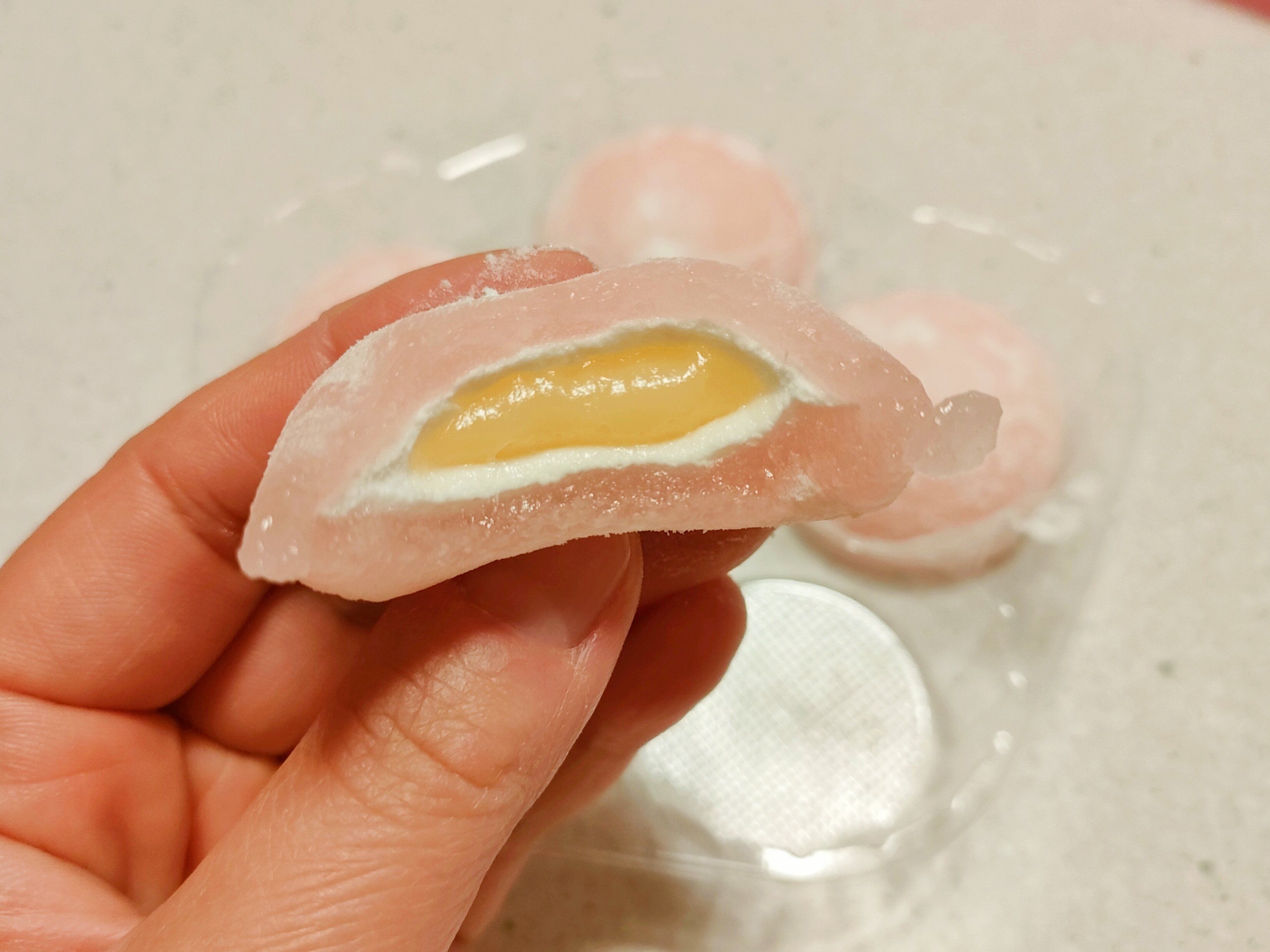 中には、まろやかなカスタードクリームと軽いホイップクリームが二層で入っています。お餅はもちもちとした弾力ある食感で、牛皮のような柔らかさもあります。