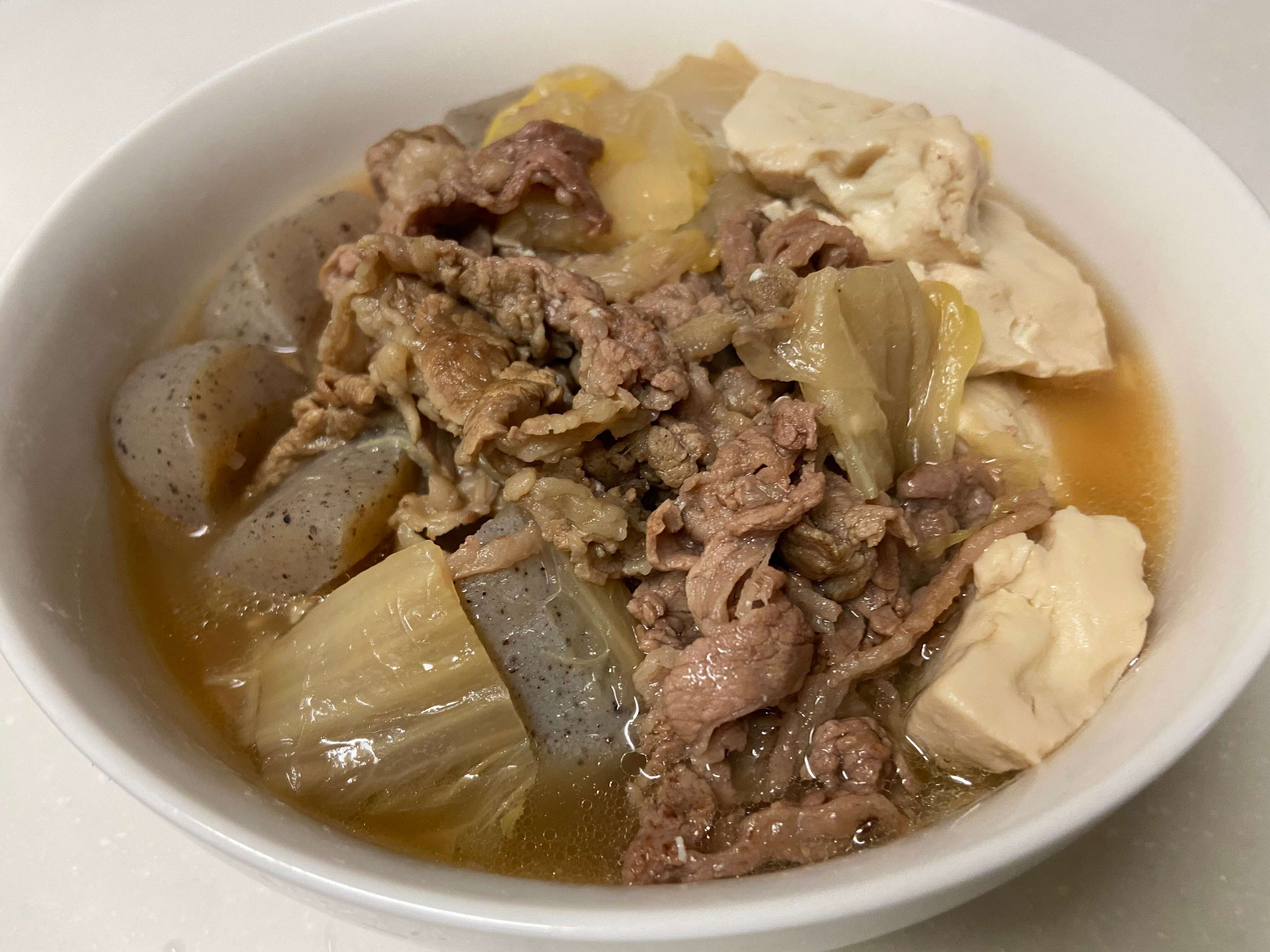 また別の日には解凍した牛バラ肉を使って、すき煮を作りました。豆腐、白菜、こんにゃくと一緒にだし汁と醤油、みりん、酒で煮てすき焼き風の味つけに。