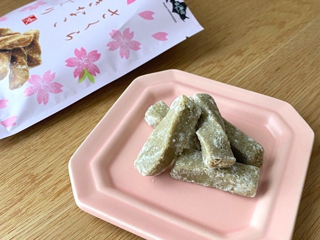 口に入った瞬間は桜の香りがひろがりますが、噛むたびにふわっふわっときなこの香りも楽しめます。ねっちり、もっちりとした食感がクセになり手が止まらない。素朴な味わいはどこか懐かしさも感じます。