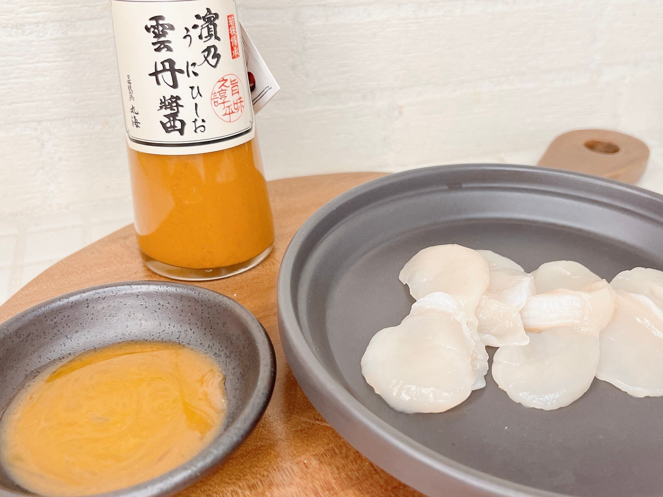雲丹醤を使用した卵かけご飯の味に似た、ウニの風味、旨みたっぷりの濃厚なソースは、ホタテの刺身や、白身魚の刺身などに良く合い、リッチな味わいになります。わさび醤油で食べる刺身もいいですが、雲丹醤を使用した濃厚なソースで食べる刺身も対照的な味わいで新鮮ですよ!