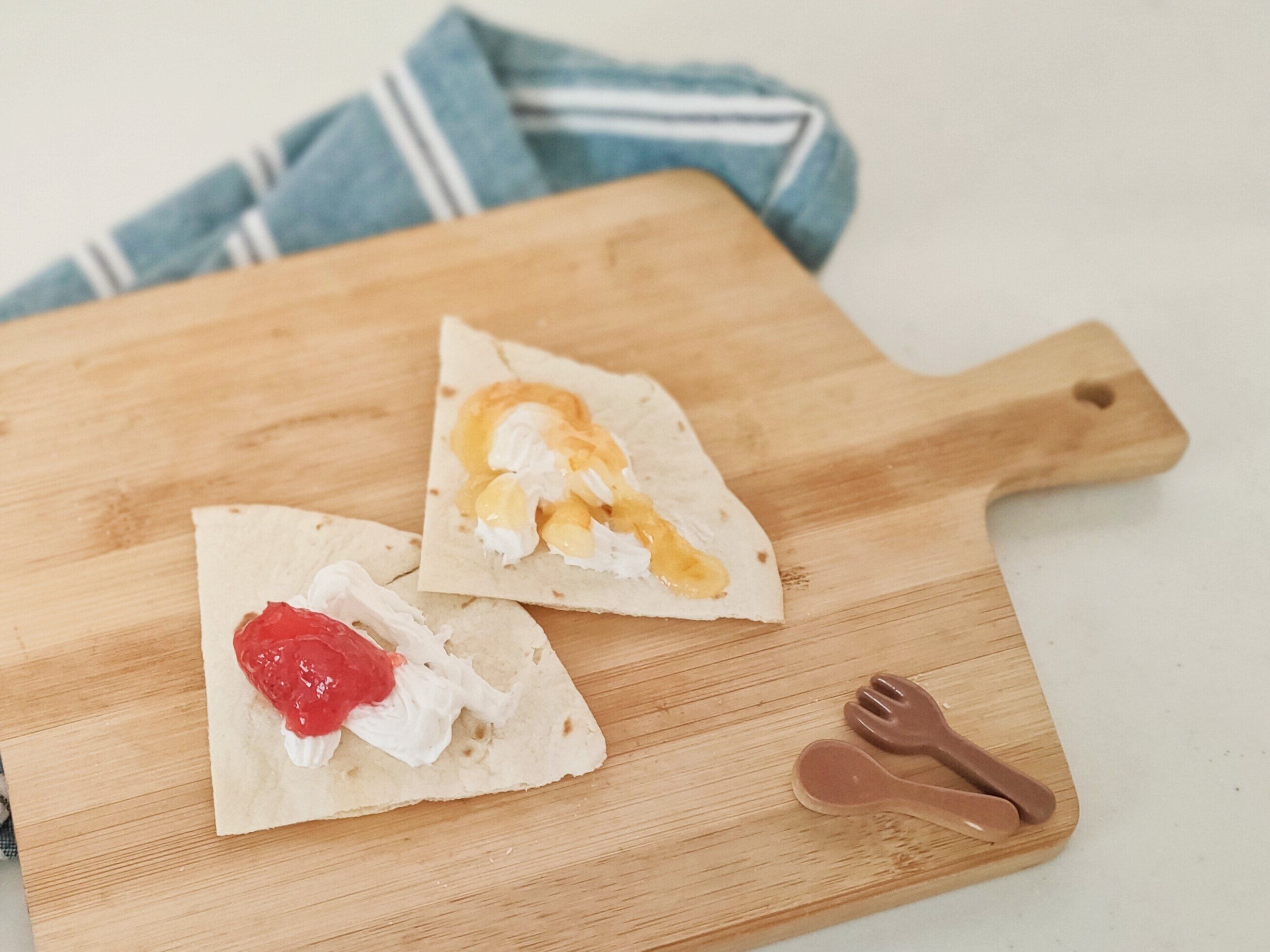 トルティーヤの表面を軽く焼いたあとに、お好みでホイップクリームやフルーツ、ジャムでトッピングして食べます。トルティーヤ自体は味がほぼないので、甘いものとの組み合わせも抜群です。