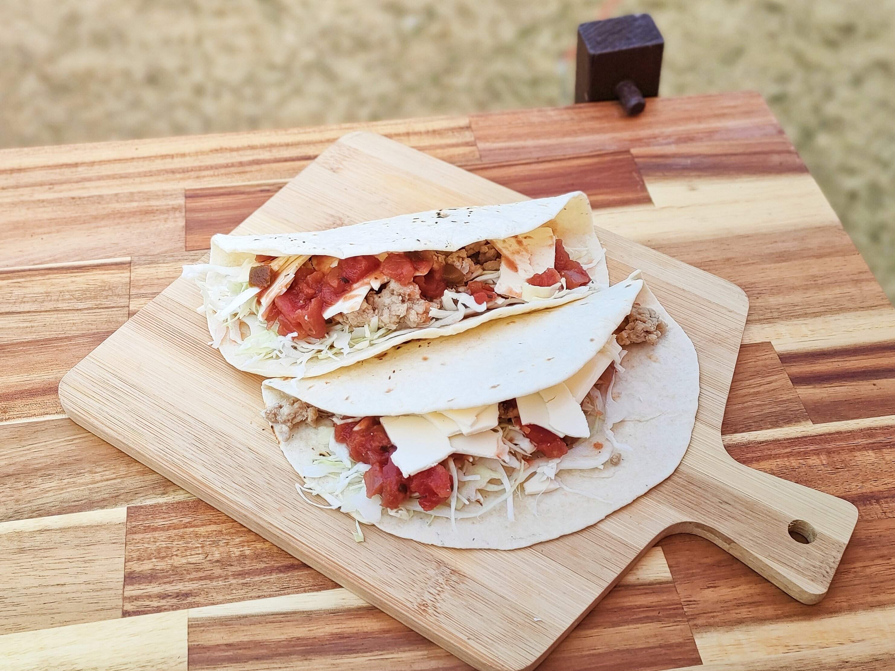 とても簡単にできるレシピで、温めたトルティーヤの上に、お好みでひき肉、チーズ、トマト、そしてサルサソースで味つけして挟むだけ!