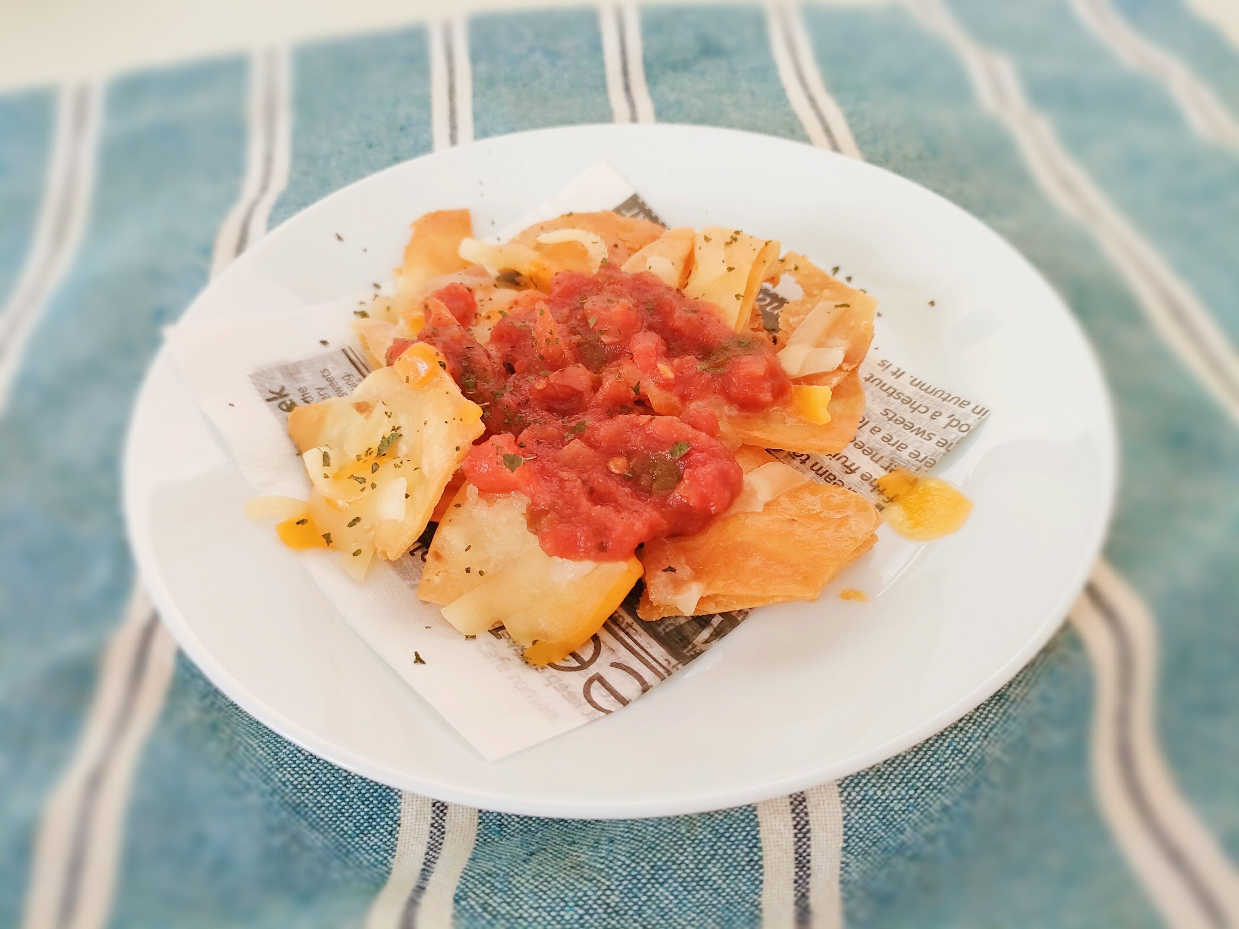 カルディのトルティーヤを油でさっと揚げて、その上にサルサソース、そして溶けるチーズをのせて、おつまみやおやつとして食べるのがオススメですね。