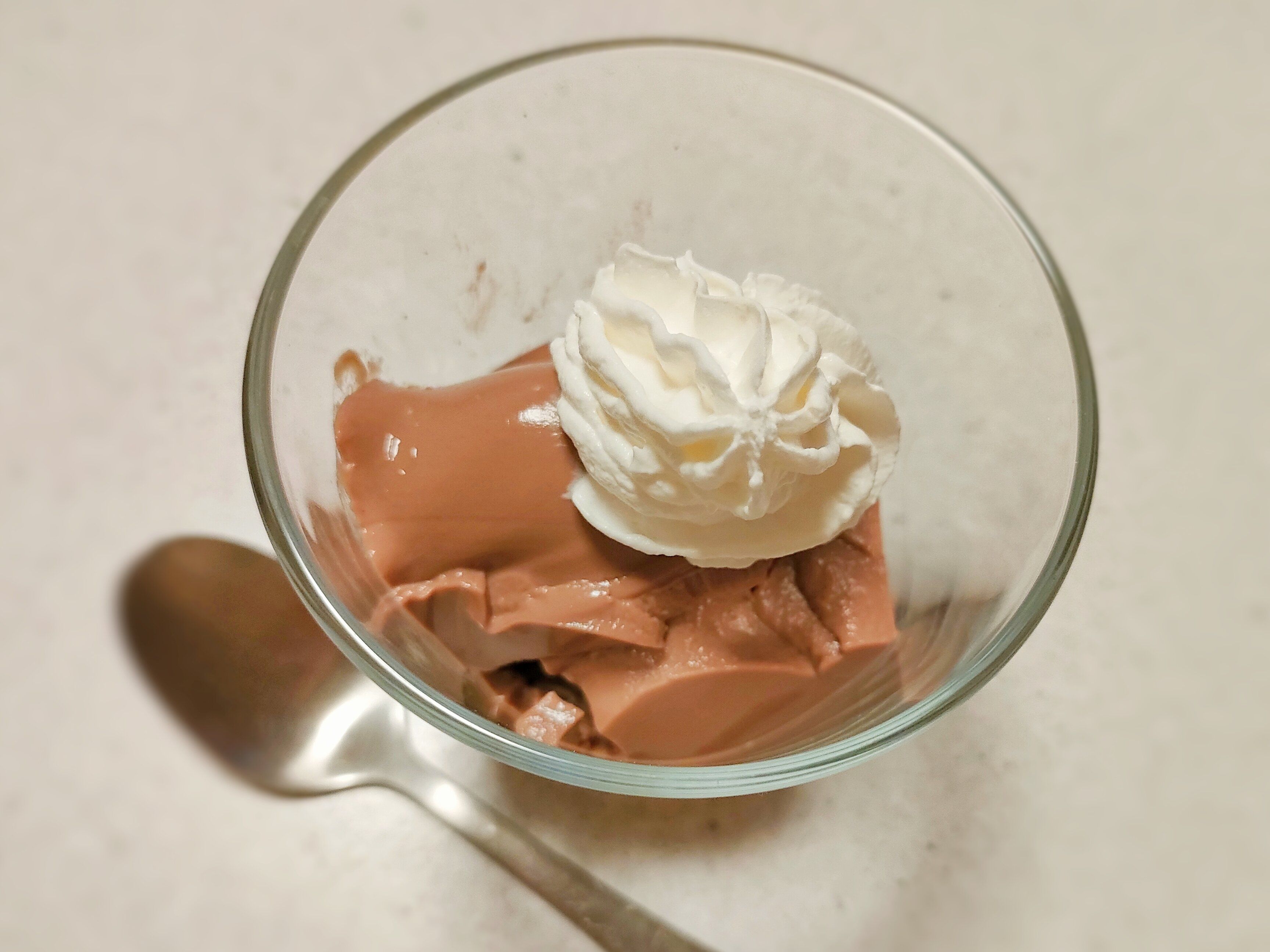 そのままのチョコプリンはビター感があって、大人向けの印象です。なので、ホイップクリームをのせてパフェ風に仕上げてみました。