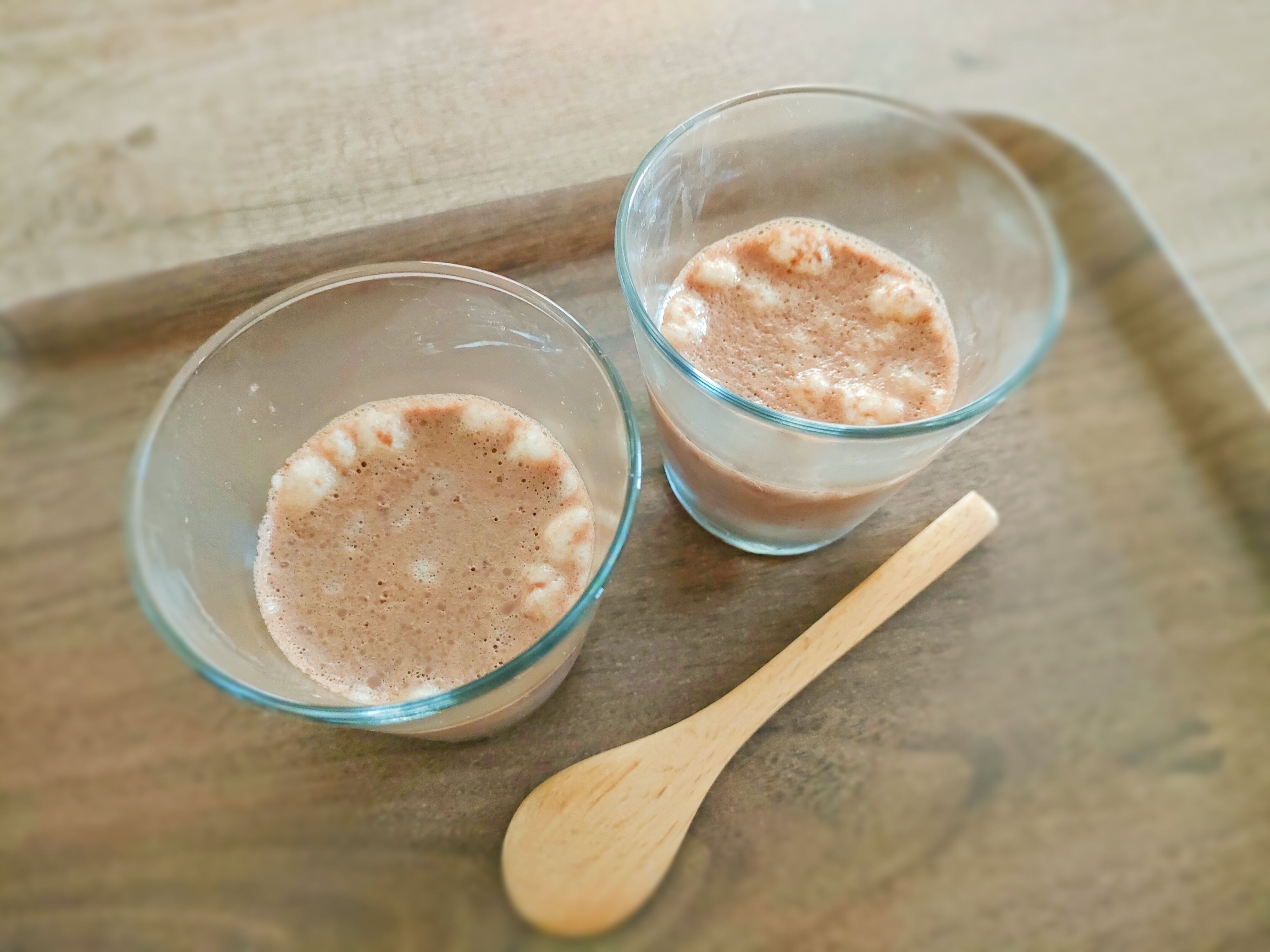 マシュマロも温めると溶ける性質があるので、いっしょに液化させることが可能です。マシュマロの甘さがビターのチョコプリンとマッチして、また違った甘さを楽しめます。