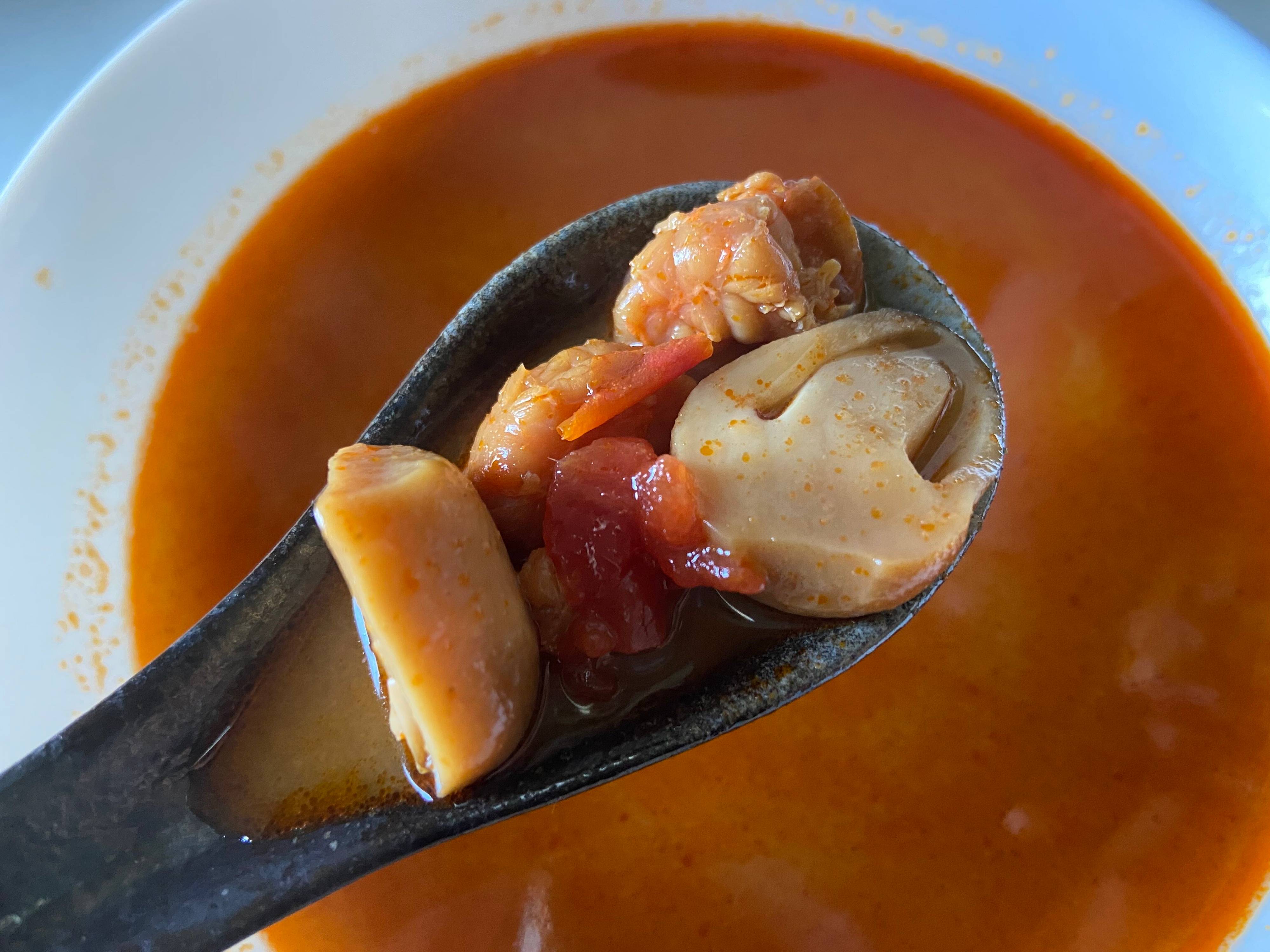 お皿にあけたら具材が沈んでいたので「あれ?スープだけ?」と思いましたが、れんげですくってみると、海老、ふくろたけ、トマトなどが入っていました。生姜、玉ねぎ、にんにくはスープに溶け込んでいるようです。