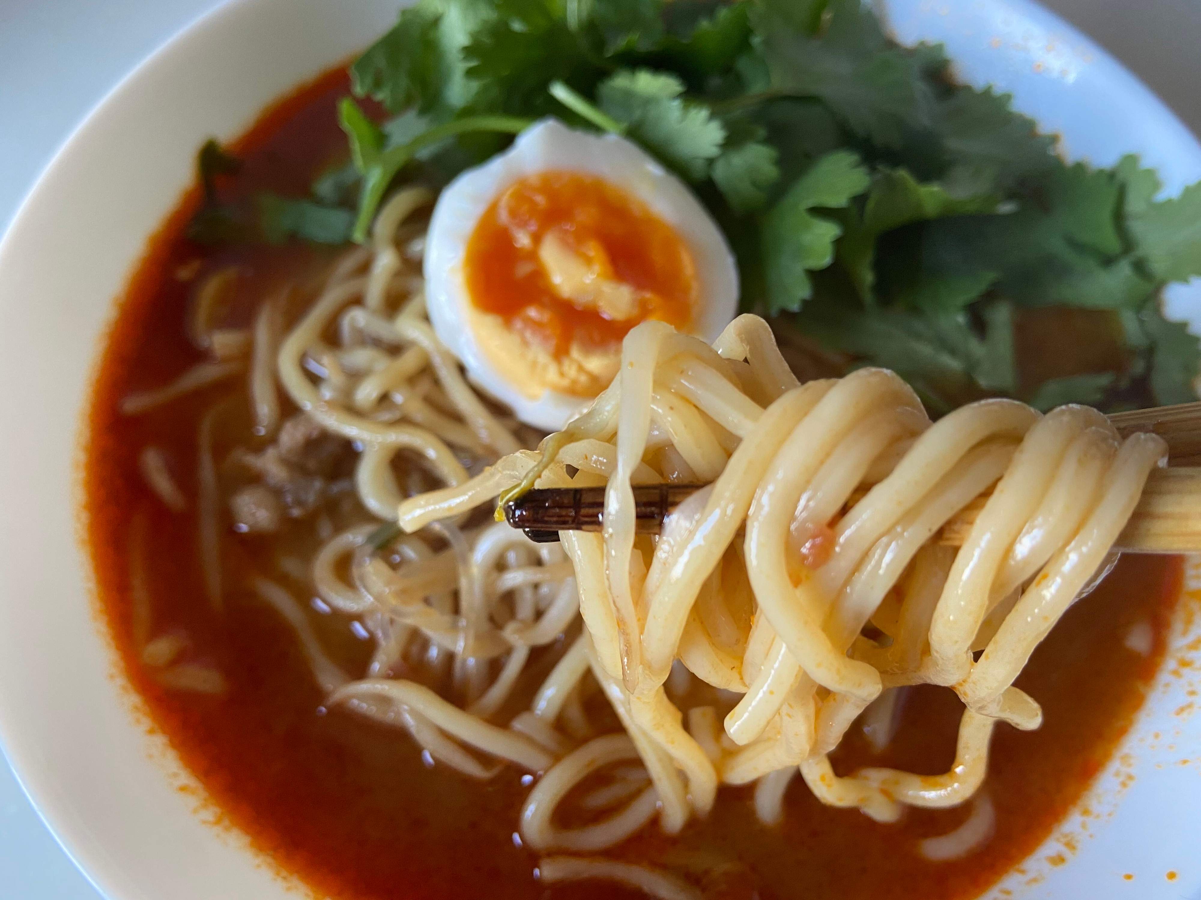 茹でた中華麺、ゆで卵、パクチーをプラスして、食べ応え満点のトムヤムクンラーメンに!