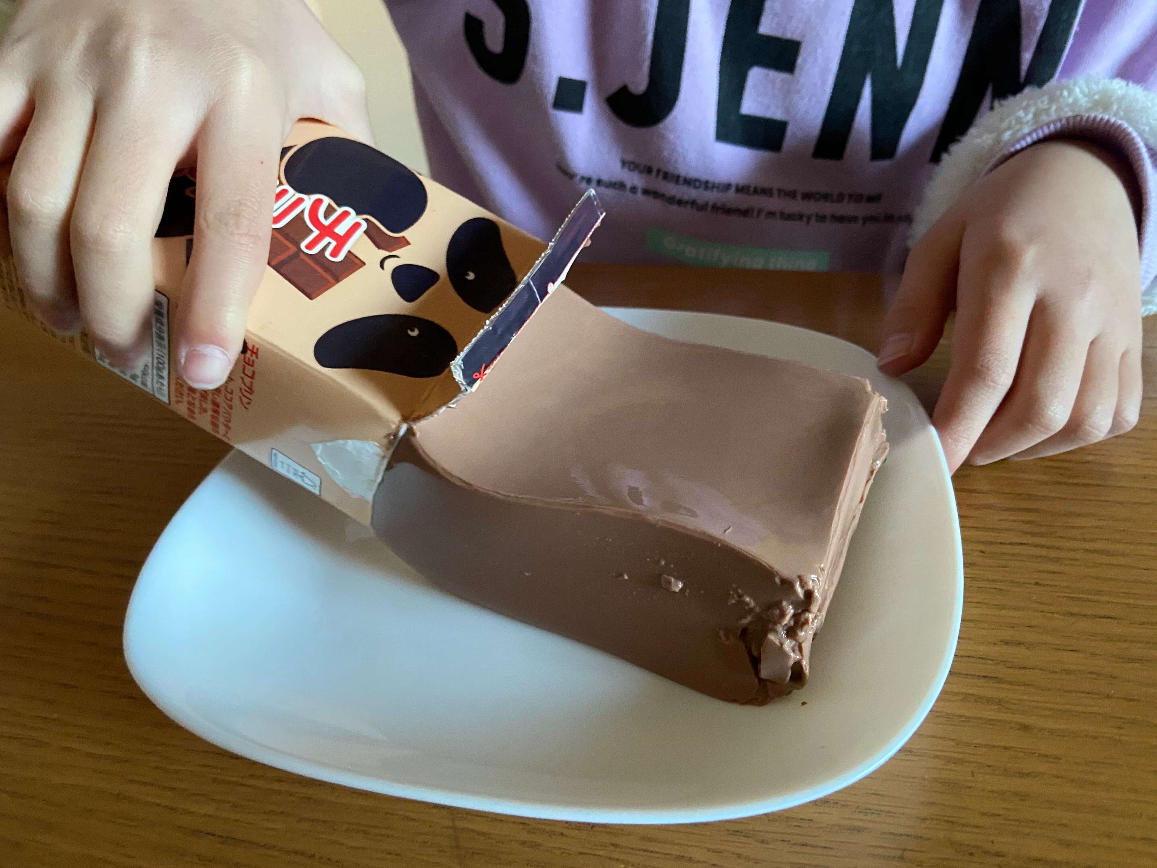 筆者の子どもたちもこの瞬間が楽しくて、「開けたい!」と積極的。パックの上部を開けて傾けると、つるんと気持ちよくプリンのかたまりが出てきます。
