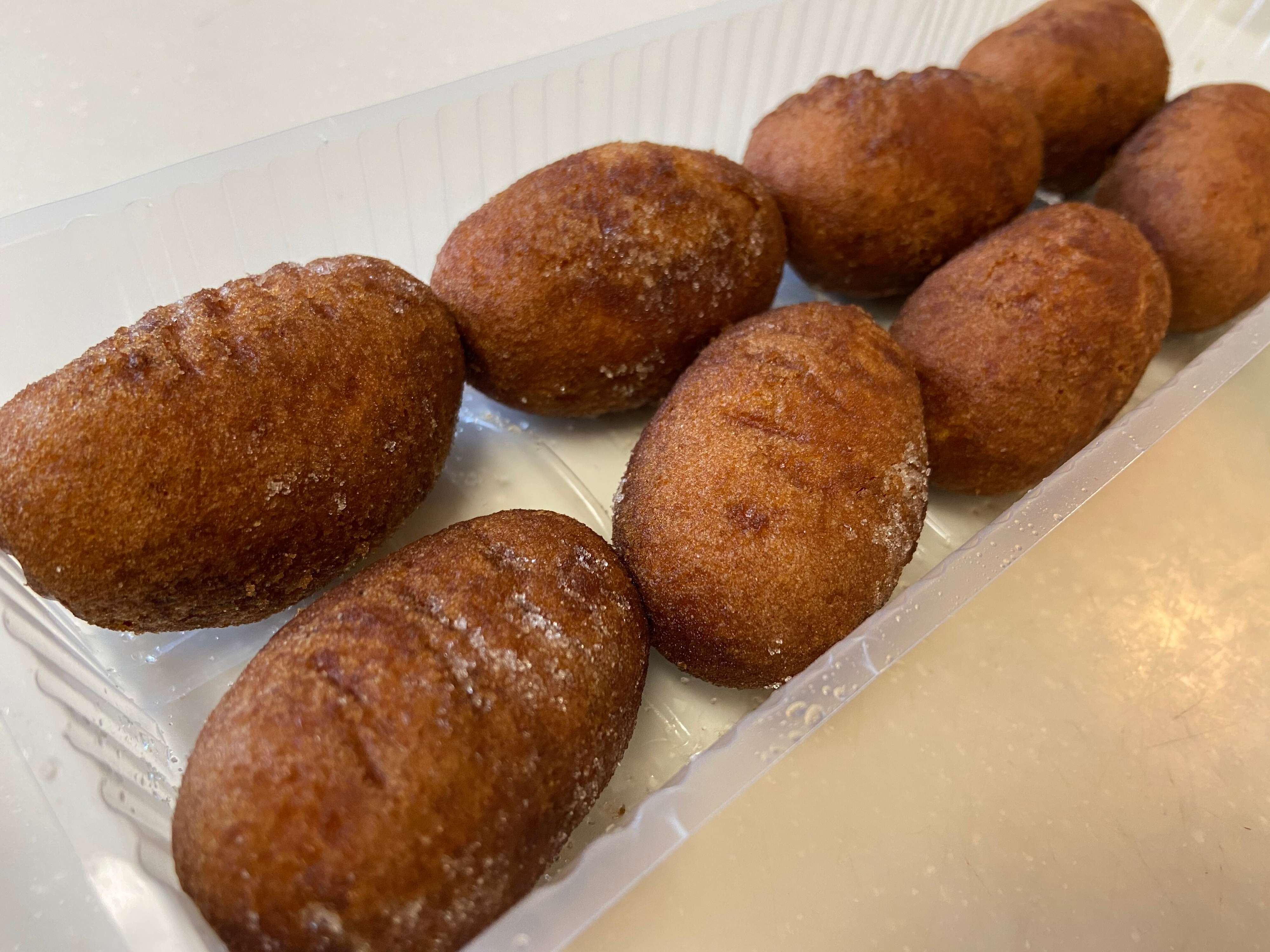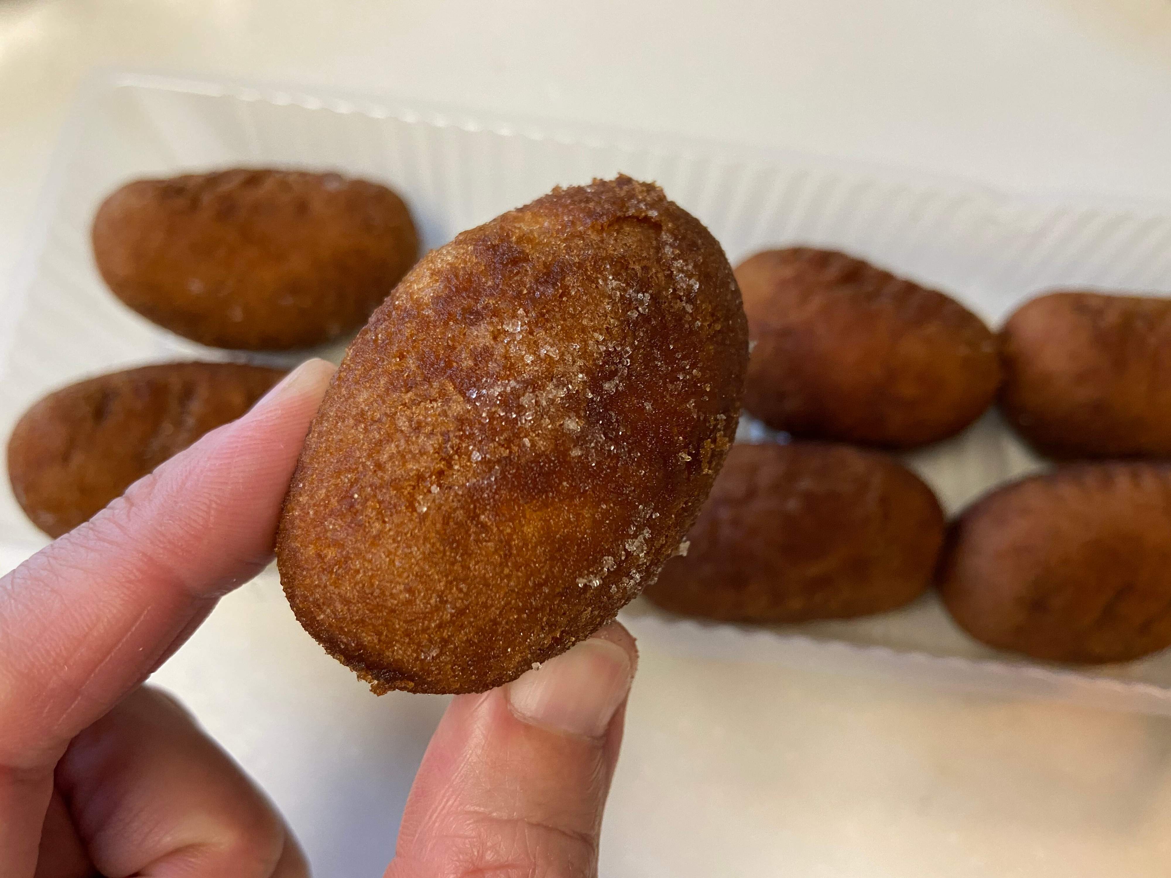 ふたくちくらいで食べられる、小さめサイズがうれしいですね。お砂糖が少しまぶされていて、持ってみるととってもしっとりしています。