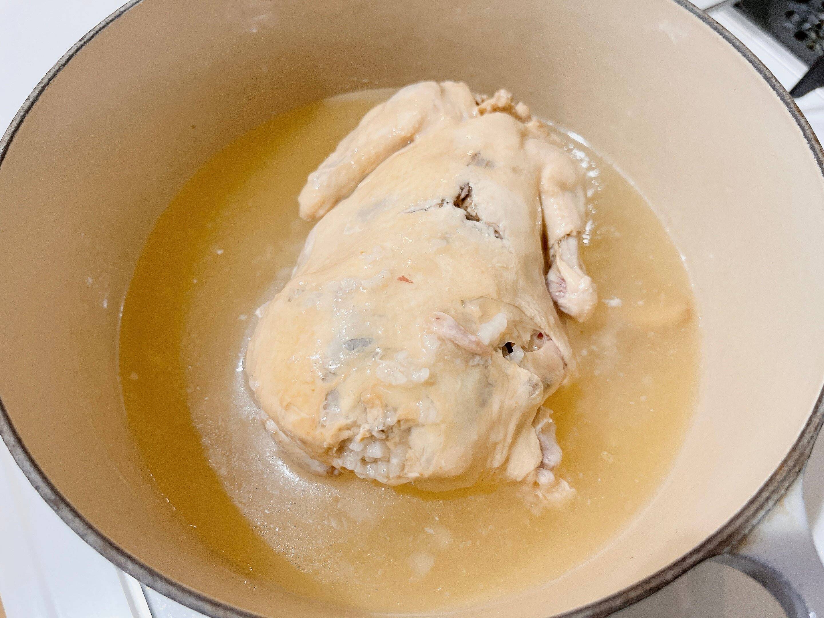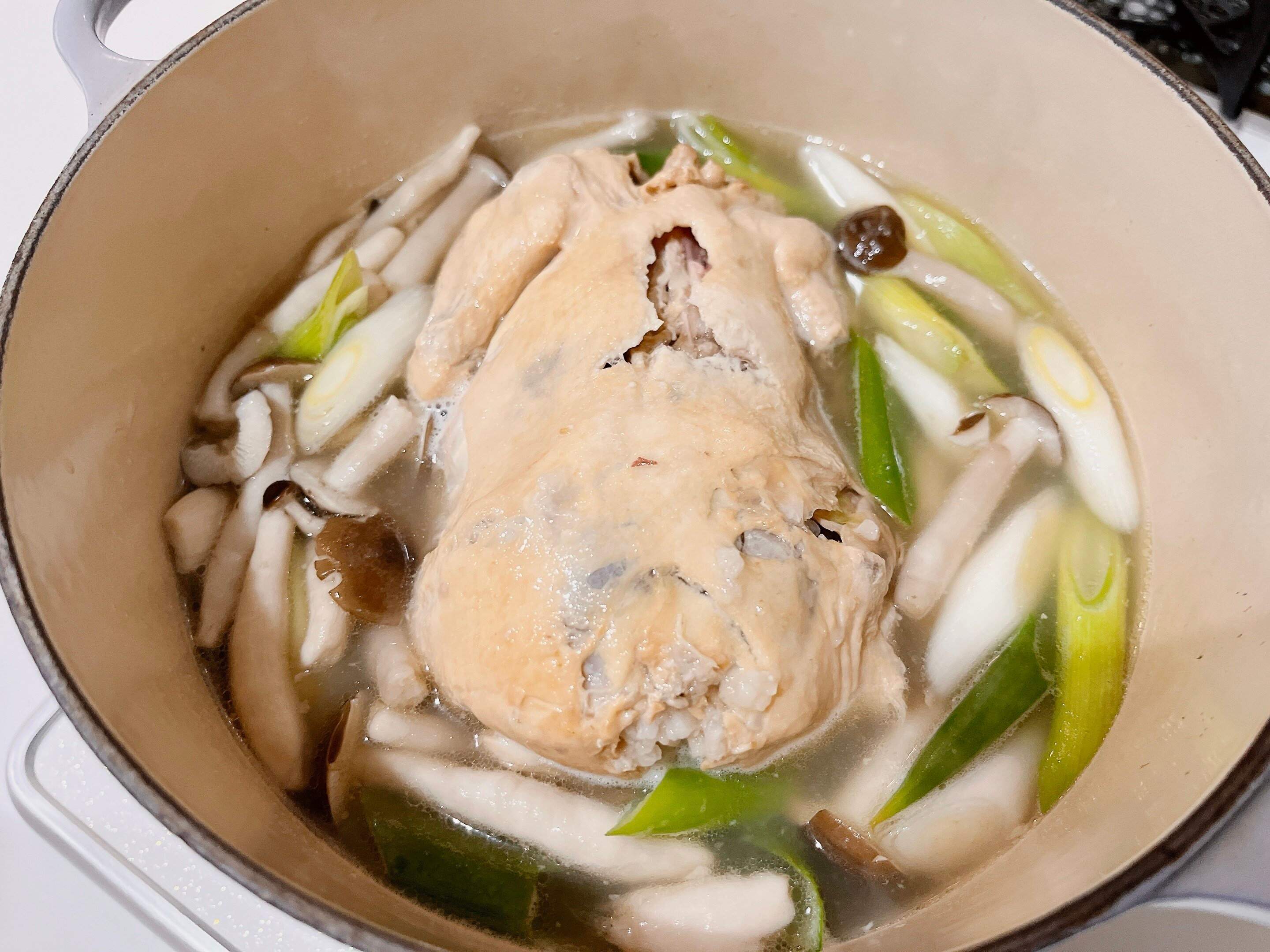 若鶏まるごと1羽のお腹の中にもち米は入っていますが、更にお米を0.5合入れ、味付けににんにく、ネギ、鶏ガラダシ、胡椒等を入れ煮込みます。煮込み終わったら若鶏もカットしてほぐすと、贅沢な鶏雑炊ができ上がります!