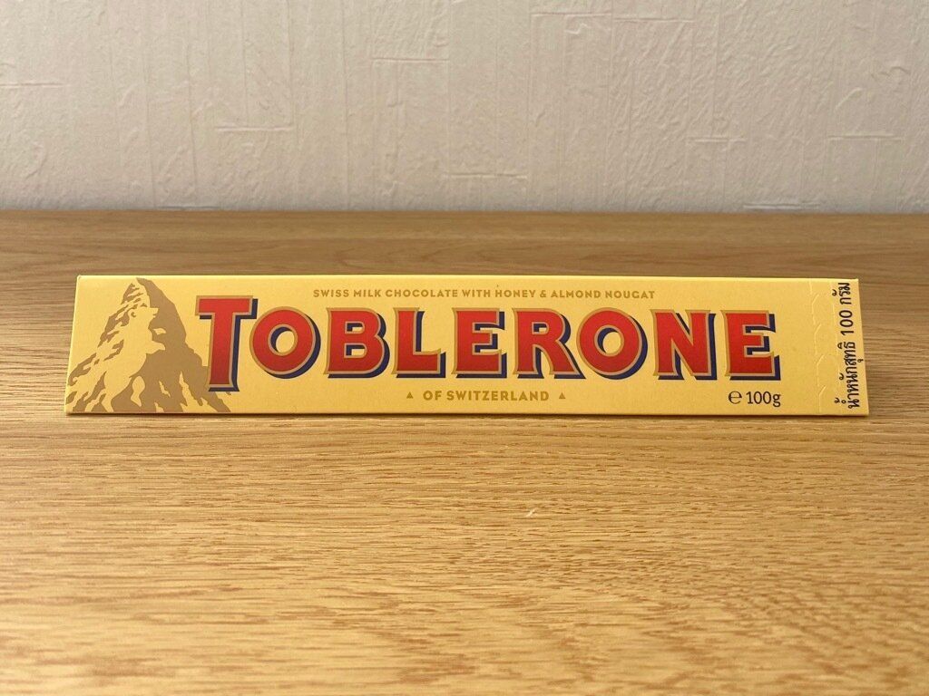 スイス・マッターホルンをかたどった三角形が特徴のトブラローネシリーズのミルクチョコレート。ミルクチョコレートに細かく砕いたアーモンドヌガーが練り込まれています。