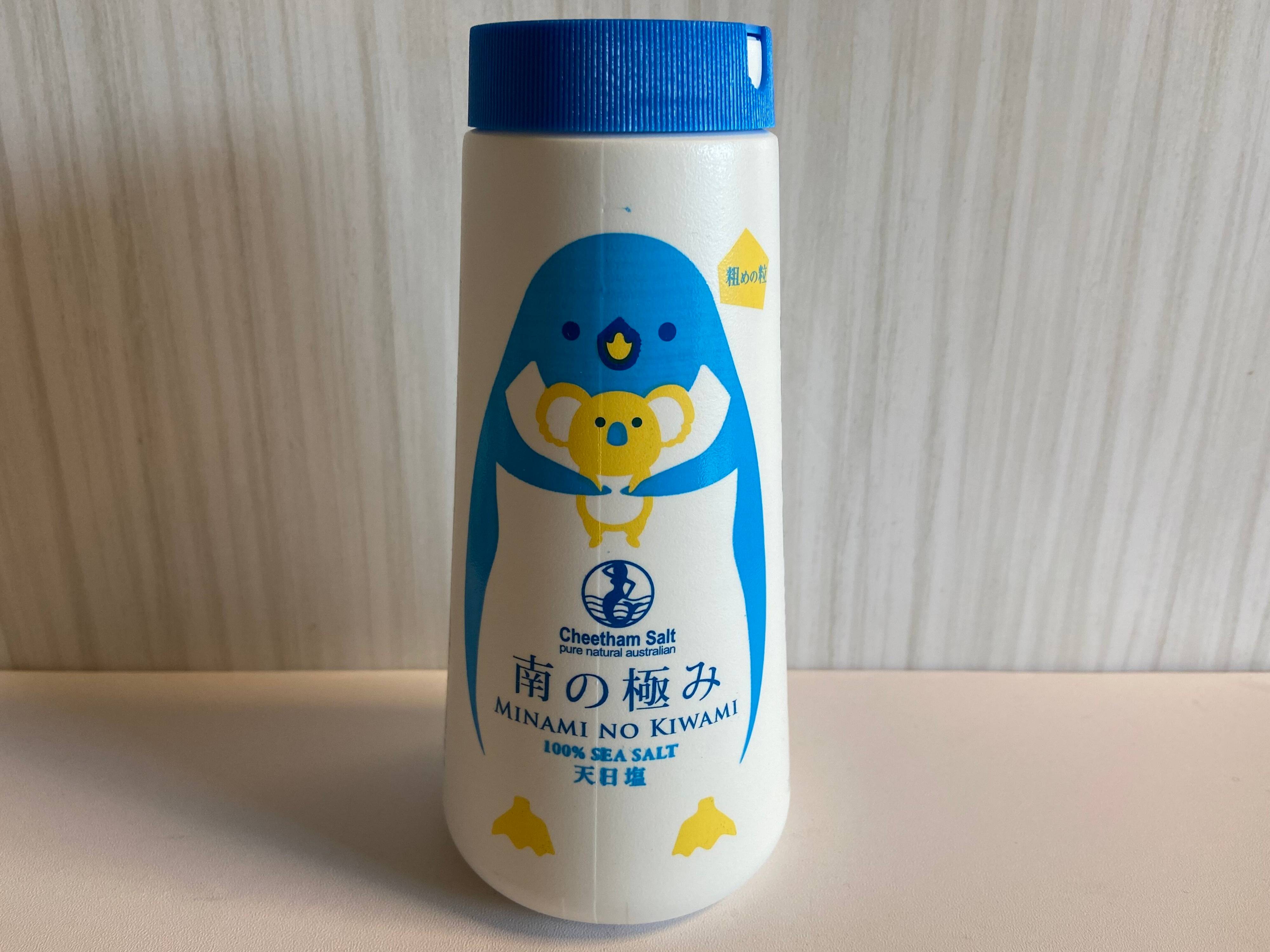 ペンギンとコアラのイラストがかわいらしい、ボトル入りの天日塩「南の極み」。