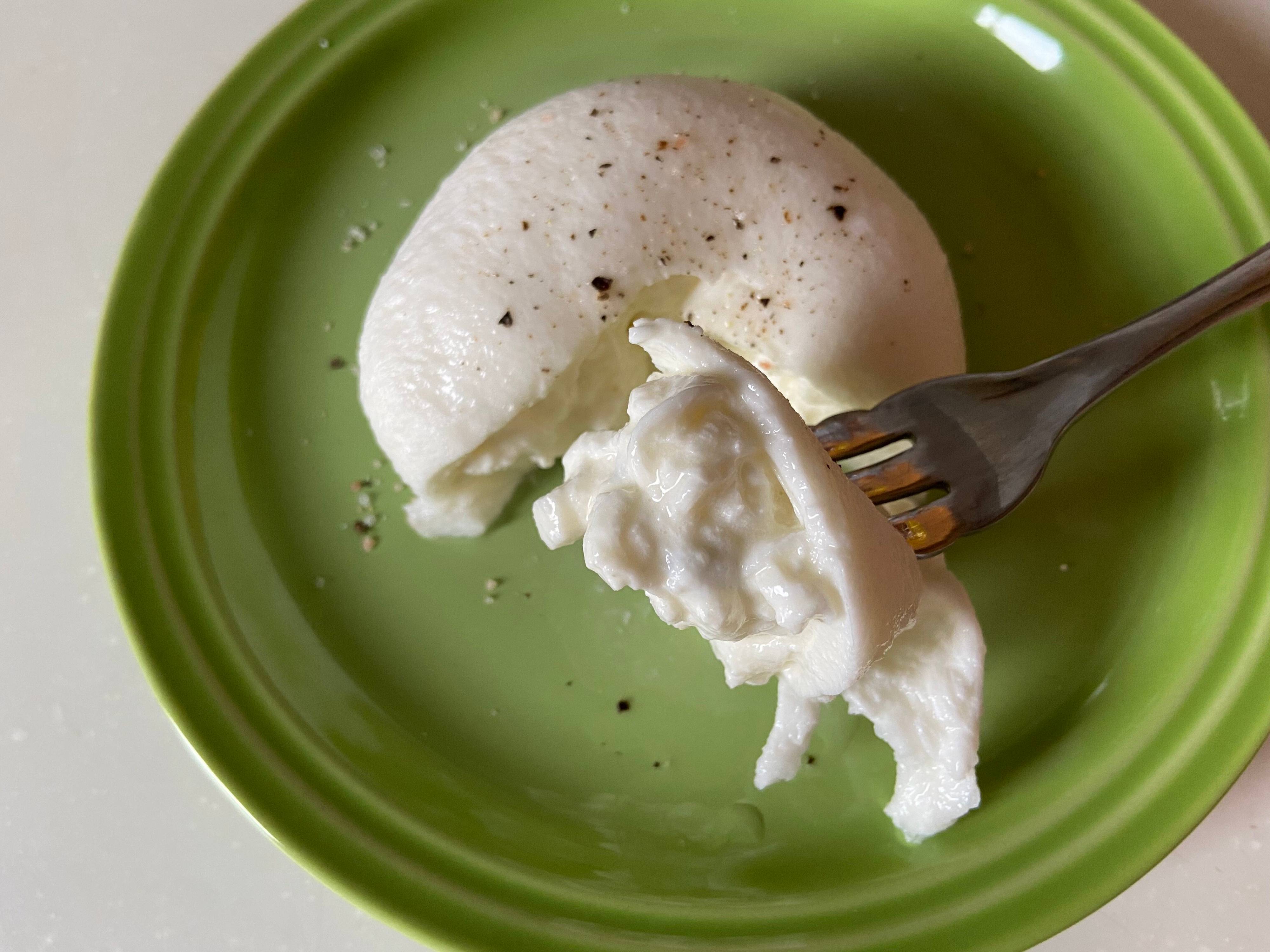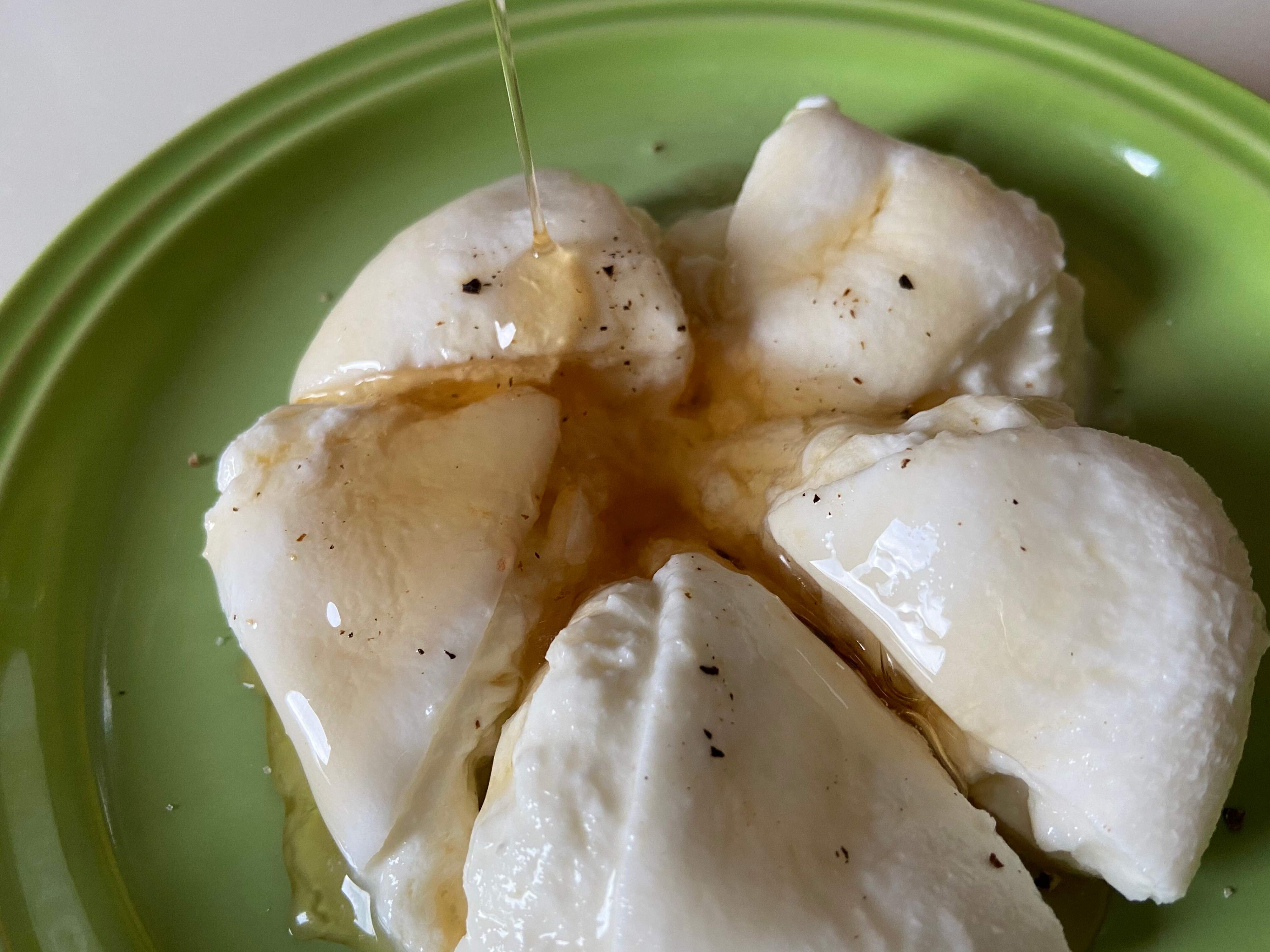 シンプルながらとってもおいしい、ブッラータの食べ方です。ぜひ塩こしょうはちょっとおいしいものを使ってみてくださいね。