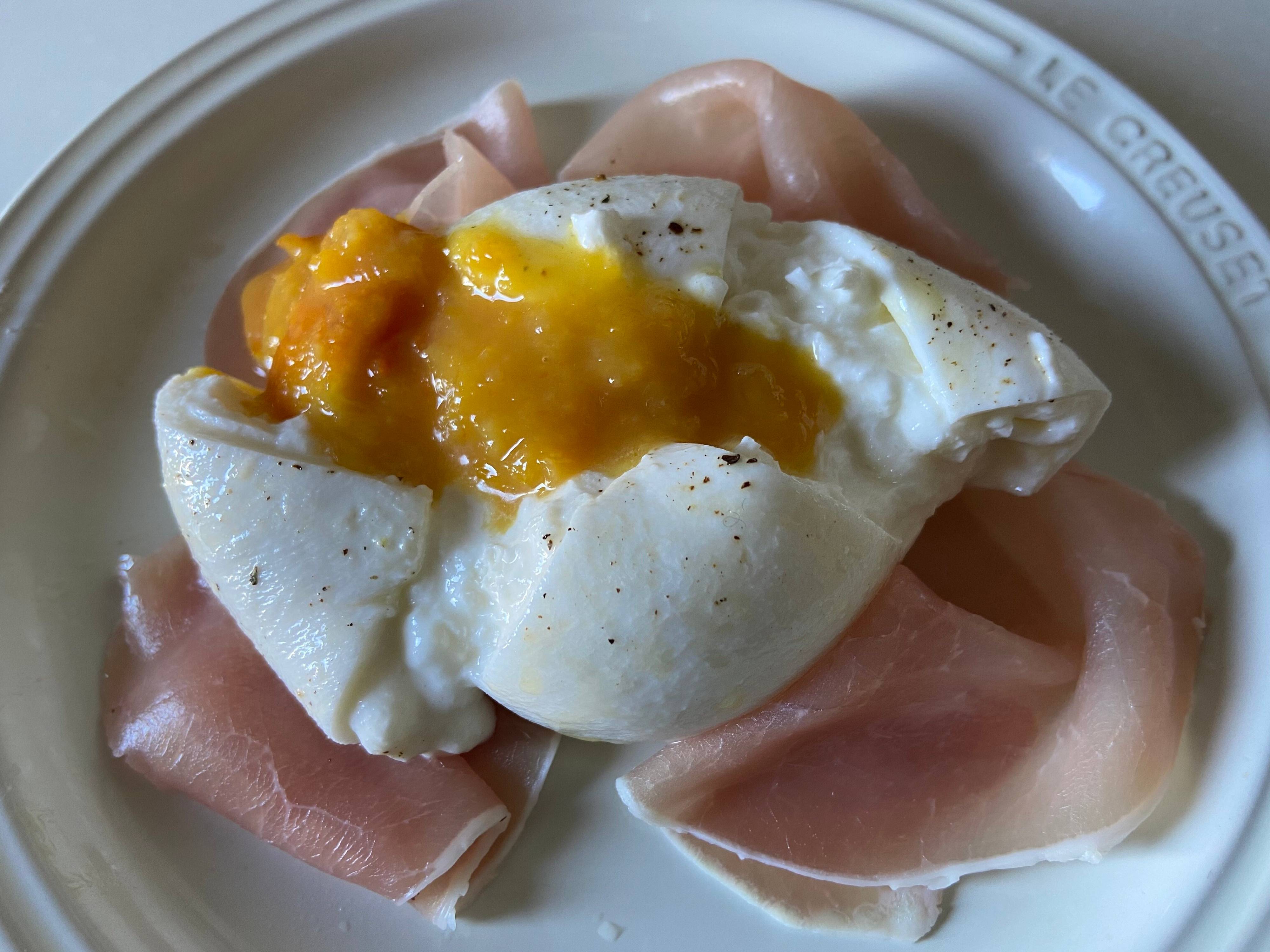 生ハムをお皿に盛りつけてブッラータチーズをのせて割り、生クリームがあふれたところにマーマレードジャムをのせます。