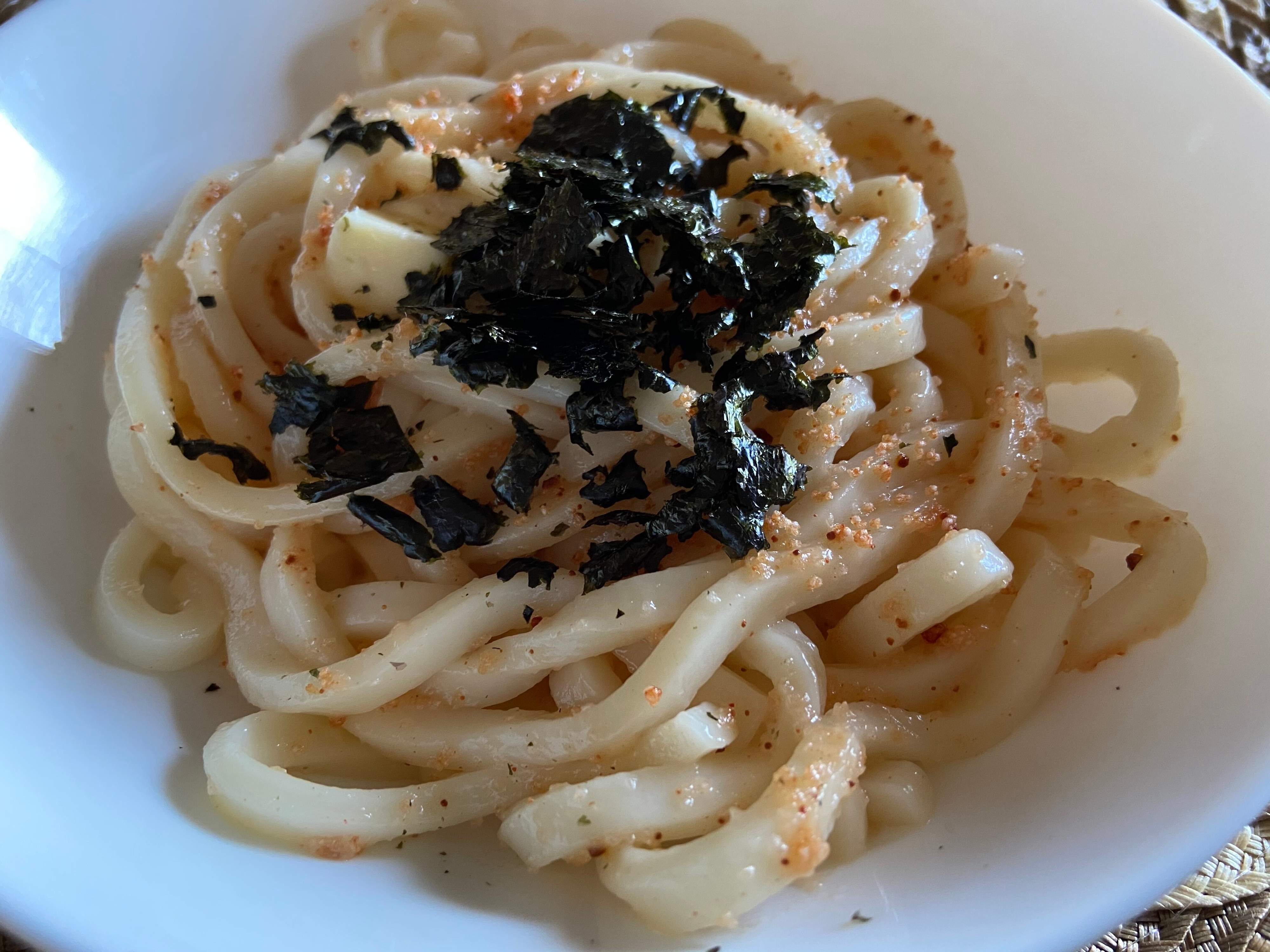 茹でたてのうどんにバターとめんたい粉、醤油を少々まわしかけて海苔をトッピングすれば、めんたいバターうどんの完成。