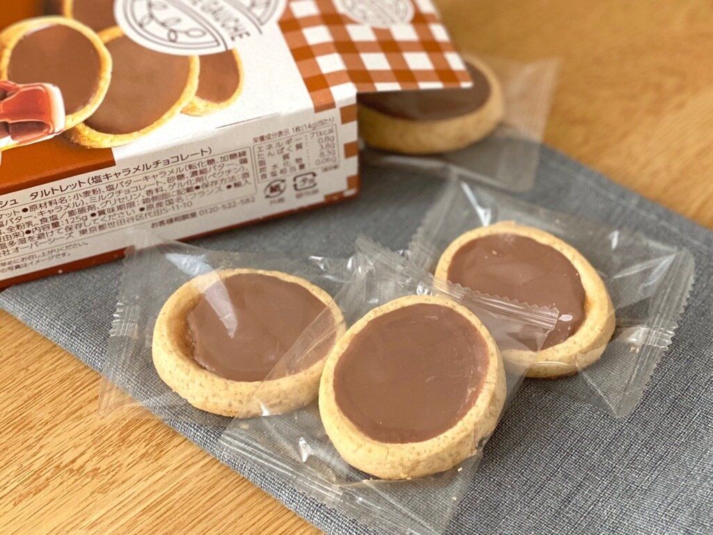 タルトクッキーの上にチョコレートと塩キャラメルをのせたフランスのクッキーです。1枚1枚個包装になって入っています。