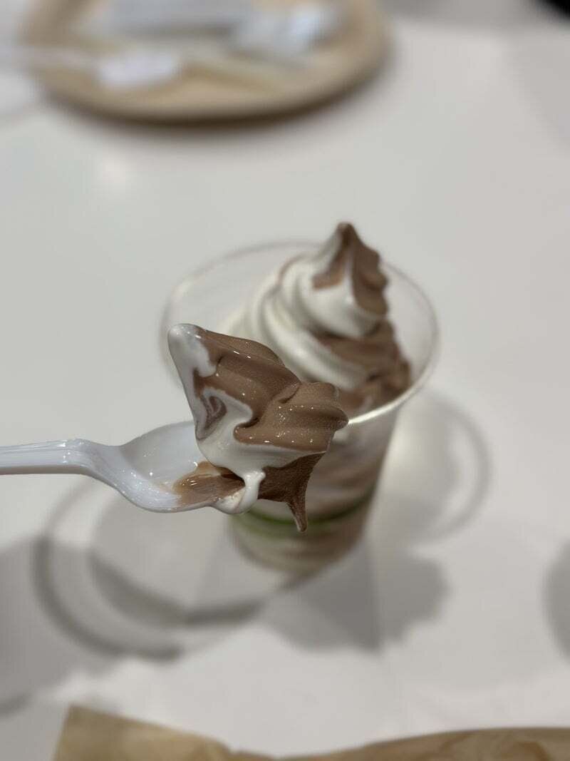 写真は北海道ミルクソフトクリームとのミックスですが、このミックスで食べると、ミルク感が加わってやさしい味わいに。