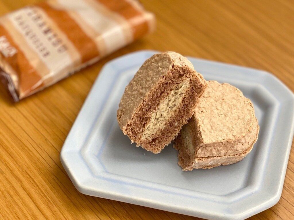 アーモンドパウダー生地に、マスカルポーネチーズパウダーとコーヒー入りのクリームをサンドした、ティラミスをイメージしたダックワーズです。洋酒を効かせ大人のリッチなテイストに仕上げているんだそう。
